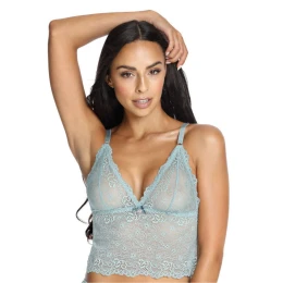 Romantický měkký podprsenka Lucky s trojúhelníkovými košíčky. Je vyroben z roztomilé krajky. Model nemá zapínání, nasazuje se přes hlavu. Ramínka jsou nastavitelná, nelze je odpojit. Uprostřed košíčků je malá mašlička s bižuterní ozdobou se symbolem firmy.