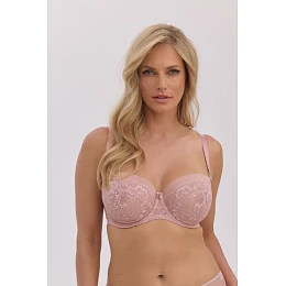 Horní část košíčku je vyrobena z elastického tylu, který se jemně přizpůsobuje tvaru prsou. Spodní část košíčku kombinuje stabilní tyl s jemnou krajkou, což vytváří efekt lehkého, ženského prádla s výjimečným charakterem. Měkký košíček bez vycpávek, profilovaný kosticemi, poskytuje dostatečnou oporu a dokonalé umístění poprsí bez pocitu ztuhlosti.