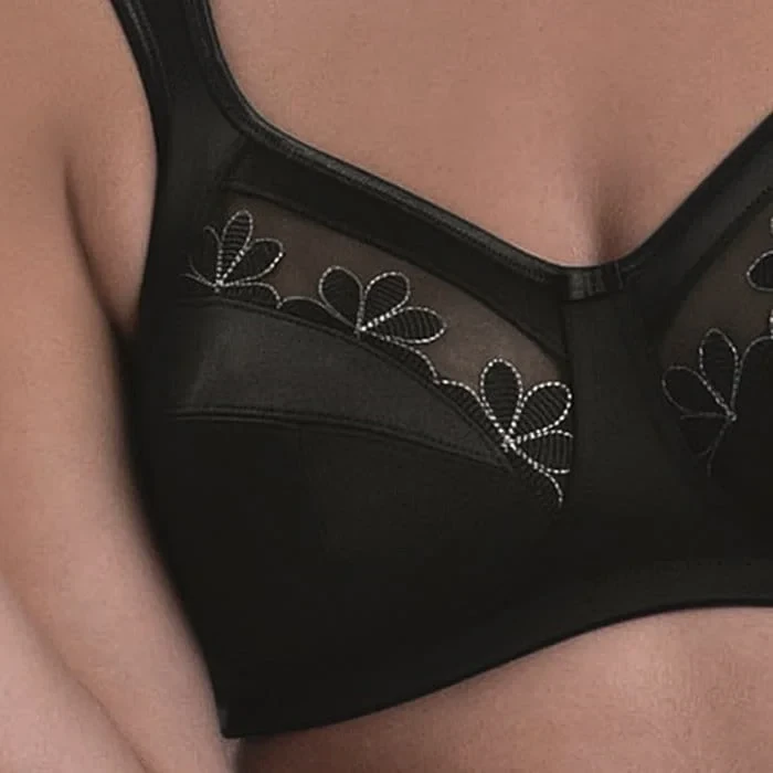 Pohodlná, měkká podprsenka bez kostic značky Anita. Vyrobená z "prodyšného", pro tělo příjemného mikrovlákna, zdobeného květinovou výšivkou na tylu. Třídílná konstrukce košíčků s bočními lištami dokonale tvaruje poprsí. Široké, měkce podšité ramenní popruhy zmírňují tlak na ramena a krk. Zajišťuje nejvyšší komfort nošení v kombinaci s dokonalou podporou i velkých prsou.