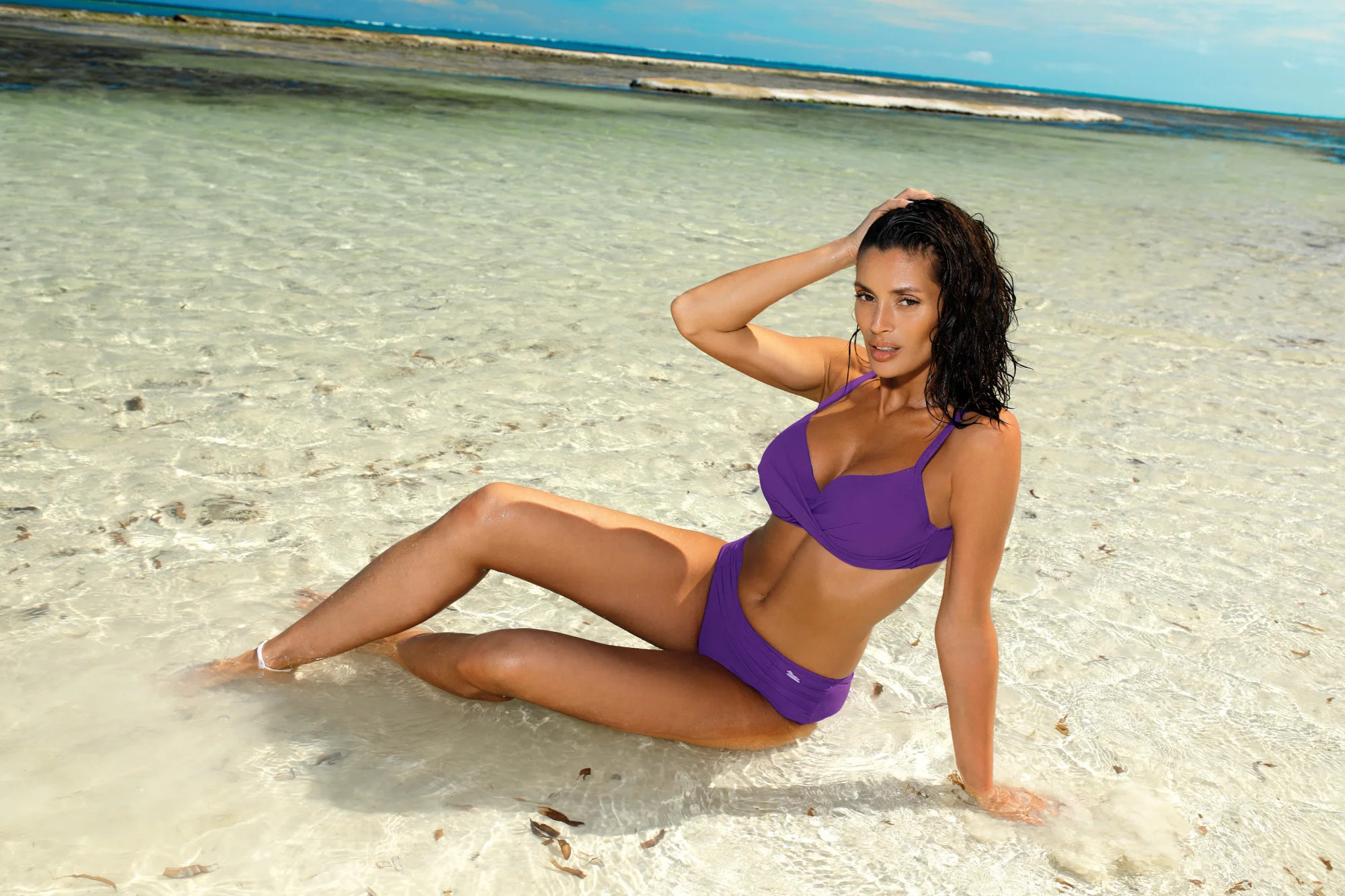 Vyrobeno z italské hladké matné tkaniny nejvyšší kvality. Identifikuje ženskost a nadčasový styl. Podprsenka má dobře tvarované, vyztužené košíčky s kosticemi, které skvěle shromažďují a tvarují prsa. Střih pěkně shrnuje, nadnáší a udržuje poprsí v atraktivní pozici. Velikosti 40/C a 42/D mají navíc push-up výplň, která je trvale umístěna v podprsence bez možnosti vyjmutí a která u menších velikostí plavek umožňuje mírné zvětšení prsou, čímž zlepšuje tělesné proporce. Ostatní velikosti nemají push-up. Obvod je pohodlně zavázán na zádech. Jsou vyšší než obvykle, jemně zakrývají větší část těla než tradiční nízké kalhoty, vpředu jsou jemně nařasené a velmi pohodlné. Kolekce na léto 2019. Složení: 80 % polyamid, 20 % elastan.