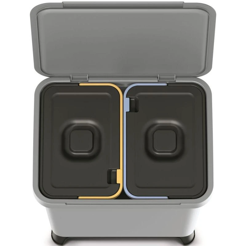 Tento malý odpadkový koš se dvěma vložkami uvnitř, z nichž každá má objem 10 l, zajišťuje rychlý přístup, snadné vyprazdňování a snadné čištění a třídění.