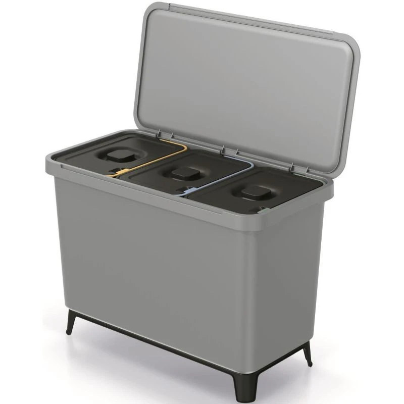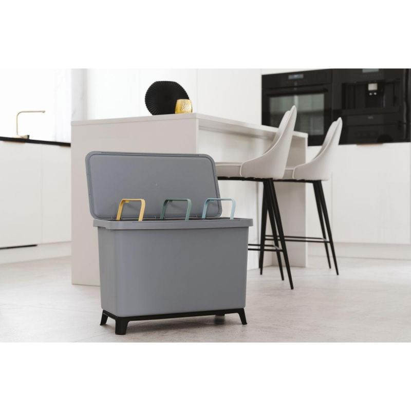 Tento funkční odpadkový koš se třemi vložkami uvnitř, z nichž každá má objem 10 l, zajišťuje rychlý přístup, snadné vyprazdňování a snadné čištění a třídění.
