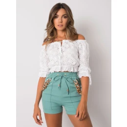 Tyrkysové šortky s ozdobnými řetízky.