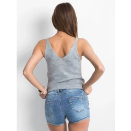 Šortky s květinovými aplikacemi v modré barvě.