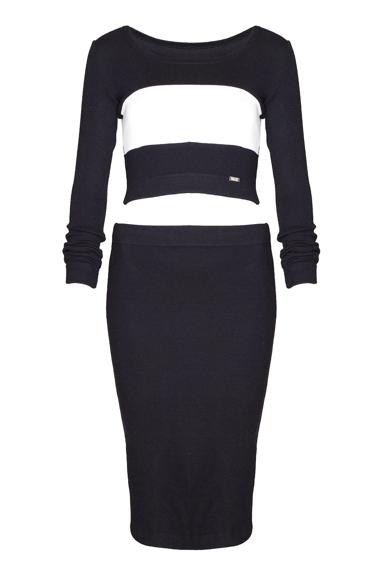 Sexy dvoudílná souprava ve stylu Kayle Kardashian. Vyrobeno z bavlny. Tužková sukně, mírně přiléhá k tělu, skvěle padne. Skvěle se bude hodit k sandálům na podpatku. Halenka s kontrastním pruhem uprostřed, který mírně odhaluje oblast bříška. Zde je mega smyslný návrh na jaro. Složení: 98 % bavlna, 2 % elastan.