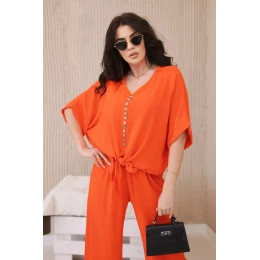 Italský komplet s halenkou zavazovanou vpředu a širokými kalhotami je ideální volbou pro ženy, které ocení pohodlí a styl vjednom. Halenka se zapíná vpředu na knoflíky, což jí dodává jemnou ženskost. Široké kalhoty z tkaniny příjemné na dotek pro volnost pohybu a pohodlné nošení. Takovou kompletní sadu můžete nosit při různých příležitostech - do práce, na rande nebo na setkání s přáteli. V kombinaci s elegantními botami a doplňky, jako je kabelka nebo šperky, vytvoří stylový a módní vzhled. Velikost je univerzální a vyhovuje dámám velikosti S, M nebo L.