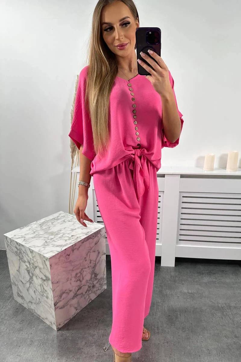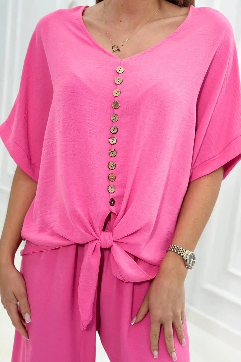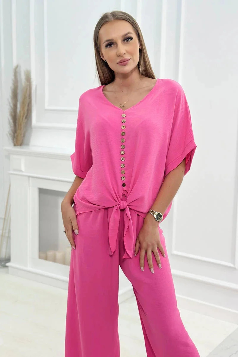 Italský komplet s halenkou zavazovanou vpředu a širokými kalhotami je ideální volbou pro ženy, které ocení pohodlí a styl vjednom. Halenka se zapíná vpředu na knoflíky, což jí dodává jemnou ženskost. Široké kalhoty z tkaniny příjemné na dotek pro volnost pohybu a pohodlné nošení. Takovou kompletní sadu můžete nosit při různých příležitostech - do práce, na rande nebo na setkání s přáteli. V kombinaci s elegantními botami a doplňky, jako je kabelka nebo šperky, vytvoří stylový a módní vzhled. Velikost je univerzální a vyhovuje dámám velikosti S, M nebo L.