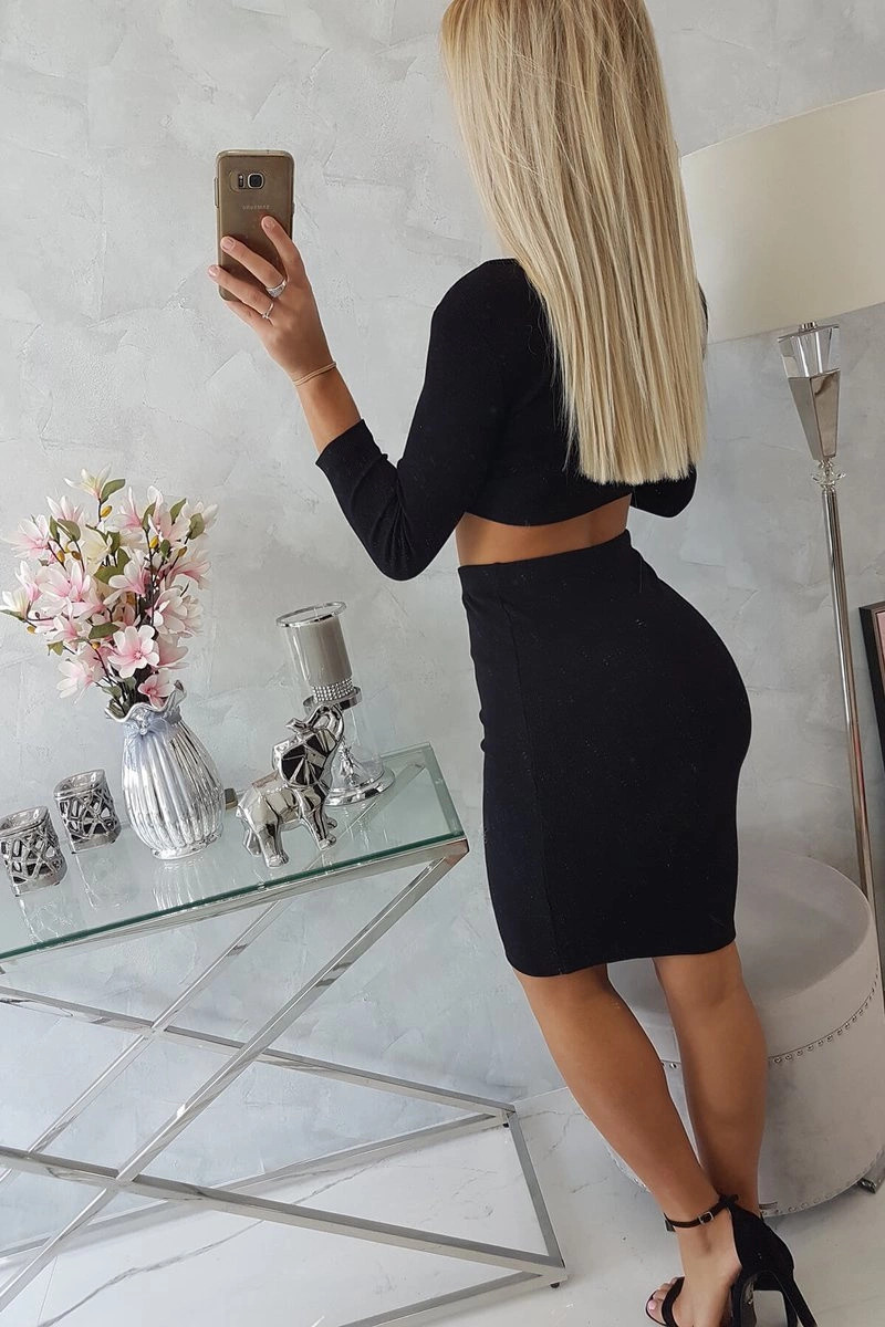 Představujeme vám sadu halenky se sukní. Halenka i sukně jsou vyrobeny z žebrované látky. Vypasovaná souprava dokonale zvýrazňuje postavu. Materiál je díky elastonu pružný. Sada je vyrobena z vysoce kvalitního materiálu. Velikost je univerzální a vyhovuje dámám velikosti XS, S nebo M.