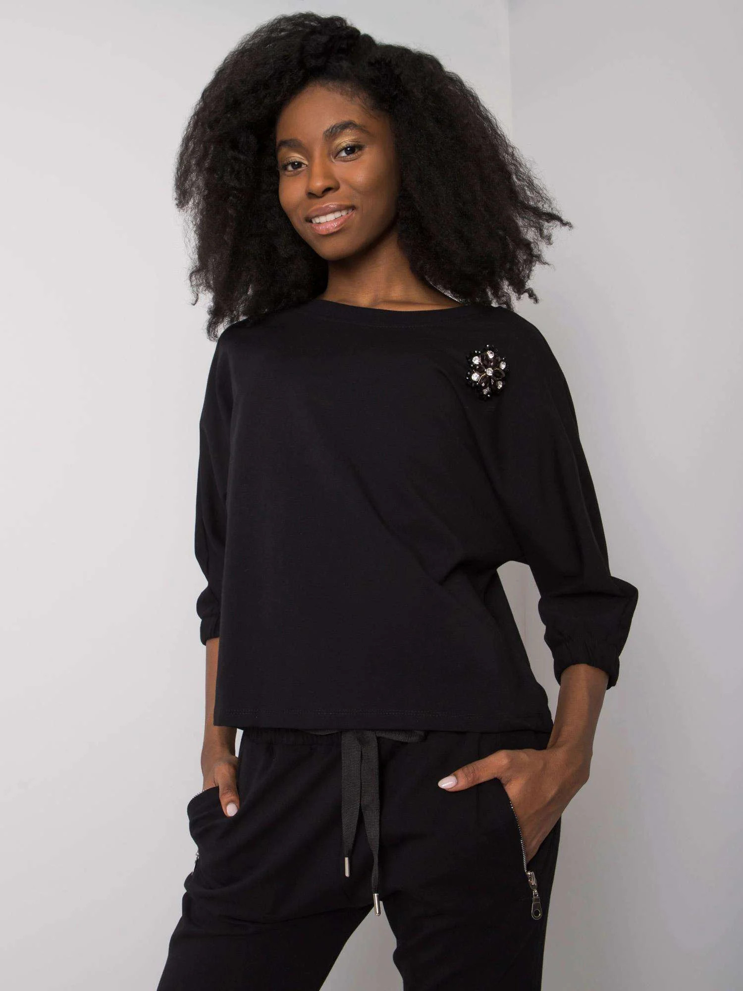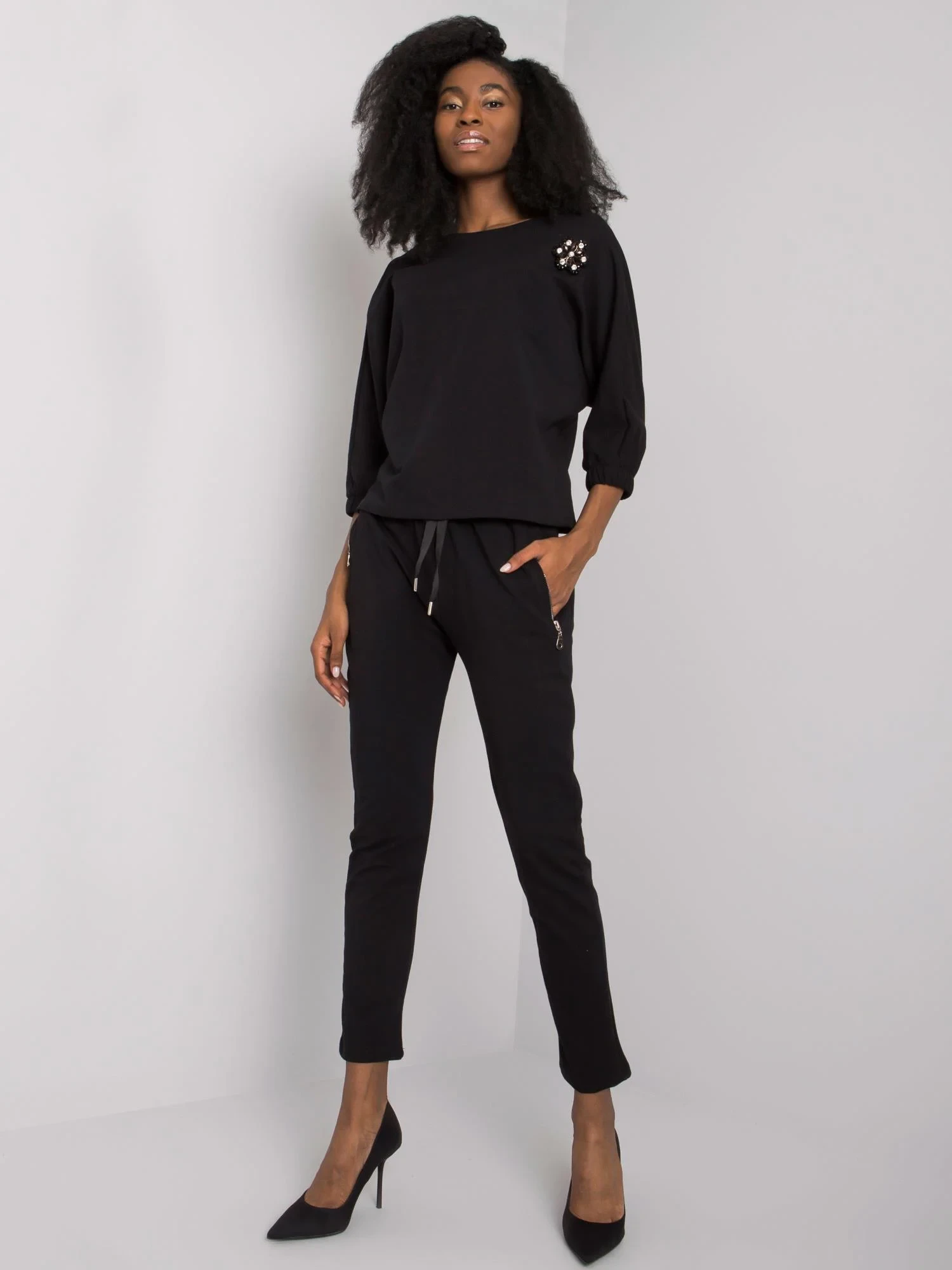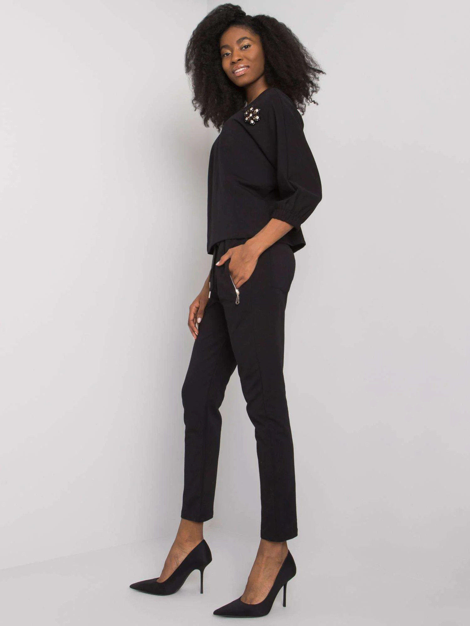 Rozměry soupravy ve velikosti S/M měřené na plocho: šířka v podpaží - 56 cm, délka halenky - 59 cm, délka rukávů - 45 cm, šířka v pase - 36 cm, délka kalhot - 99 cm.
