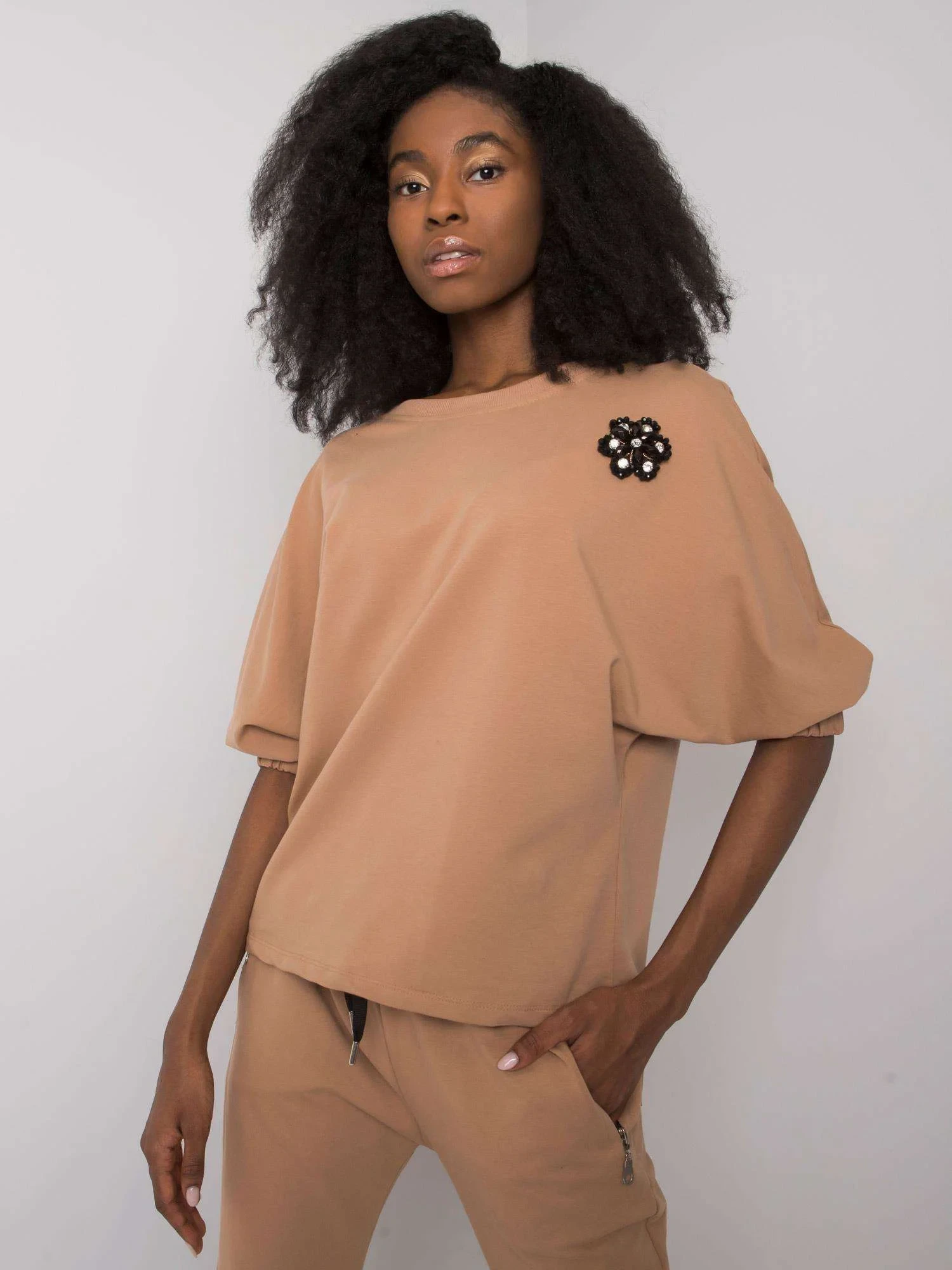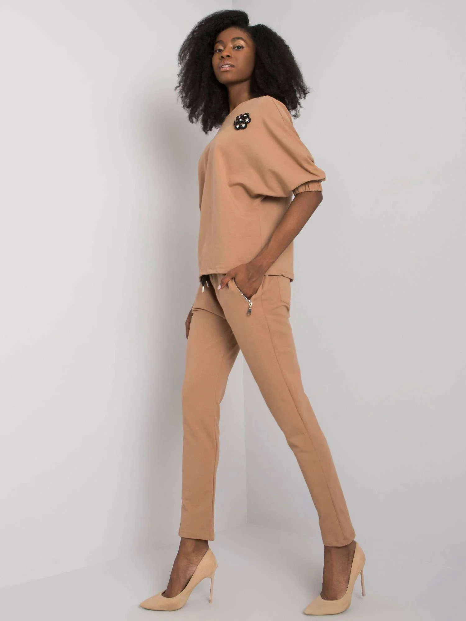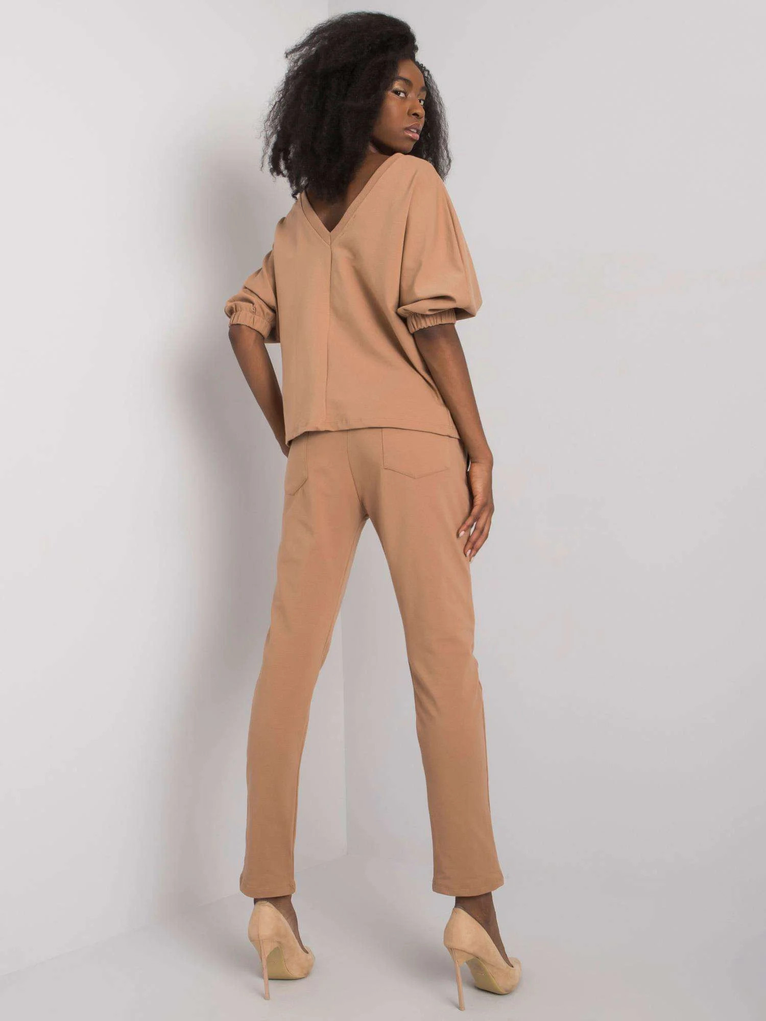 Rozměry soupravy ve velikosti S/M měřené na plocho: šířka v podpaží - 56 cm, délka halenky - 59 cm, délka rukávů - 45 cm, šířka v pase - 36 cm, délka kalhot - 99 cm.