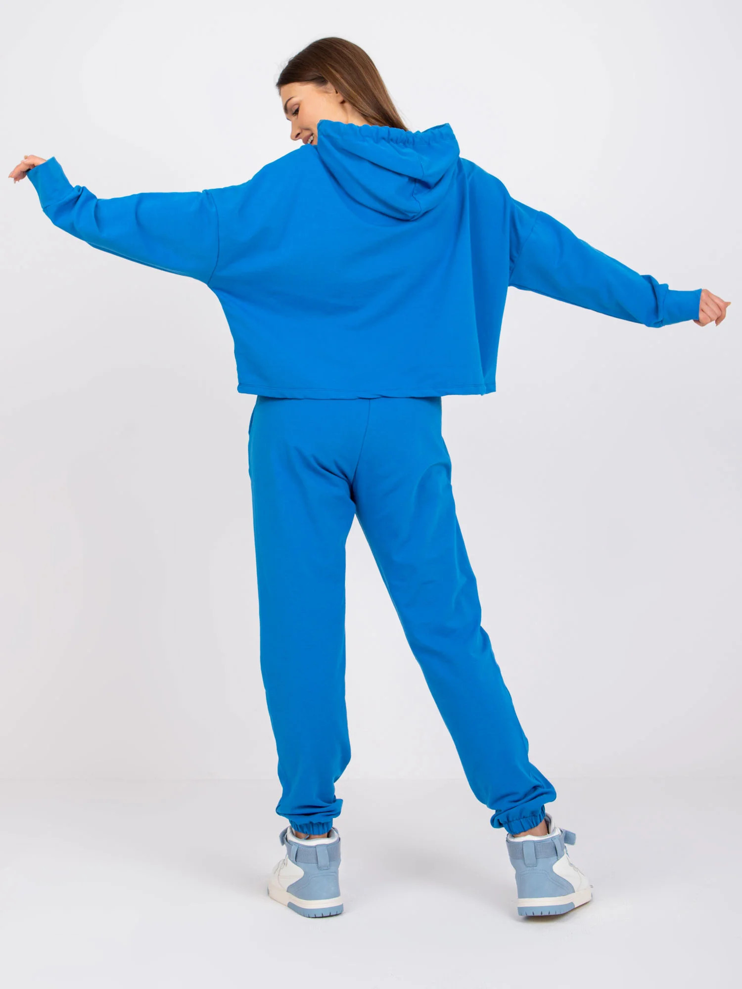 Rozměry soupravy ve velikosti S/M měřené na plocho: šířka mikiny v podpaží - 71 cm, délka rukávu - 58 cm, délka mikiny - 53 cm, šířka kalhot v pase - 34 cm, délka kalhot - 100 cm.