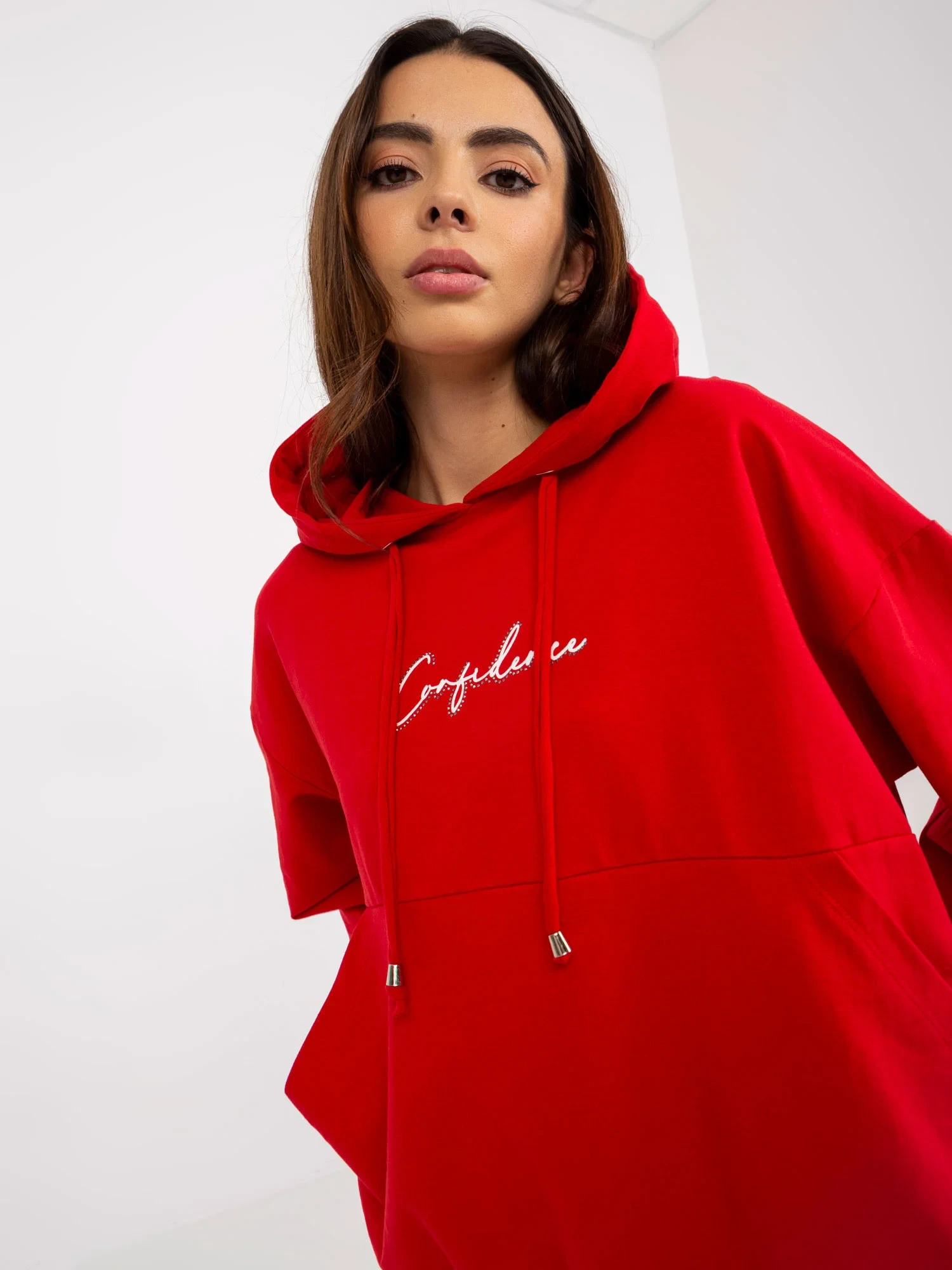 Modelka má na sobě velikost S/M. Rozměry modelky: výška 175 cm, poprsí 84 cm, pas 61 cm, boky 91 cm.