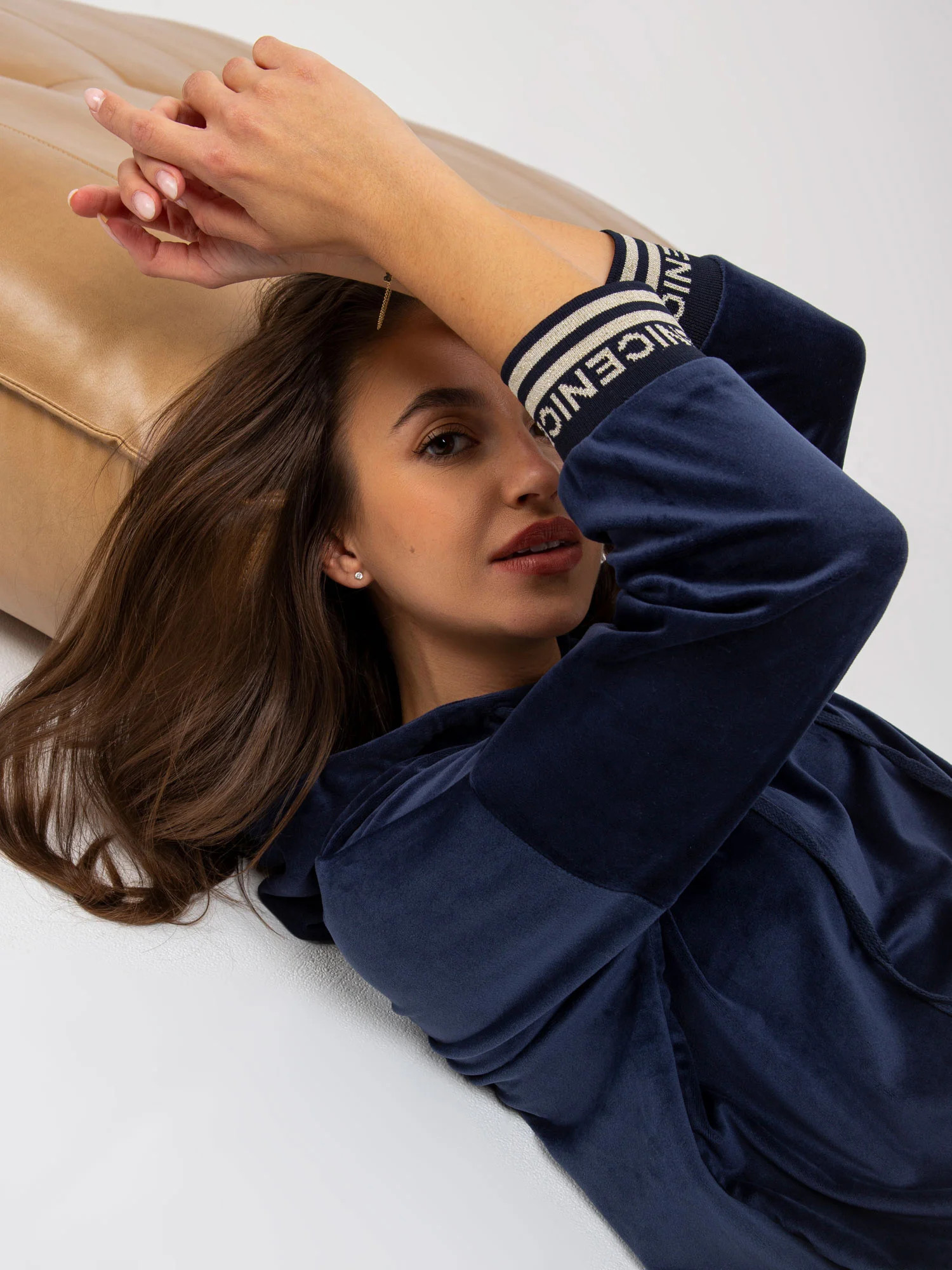 Modelka má na sobě velikost S/M. Rozměry modelky: výška 172 cm, poprsí 88 cm, pas 63 cm, boky 92 cm.