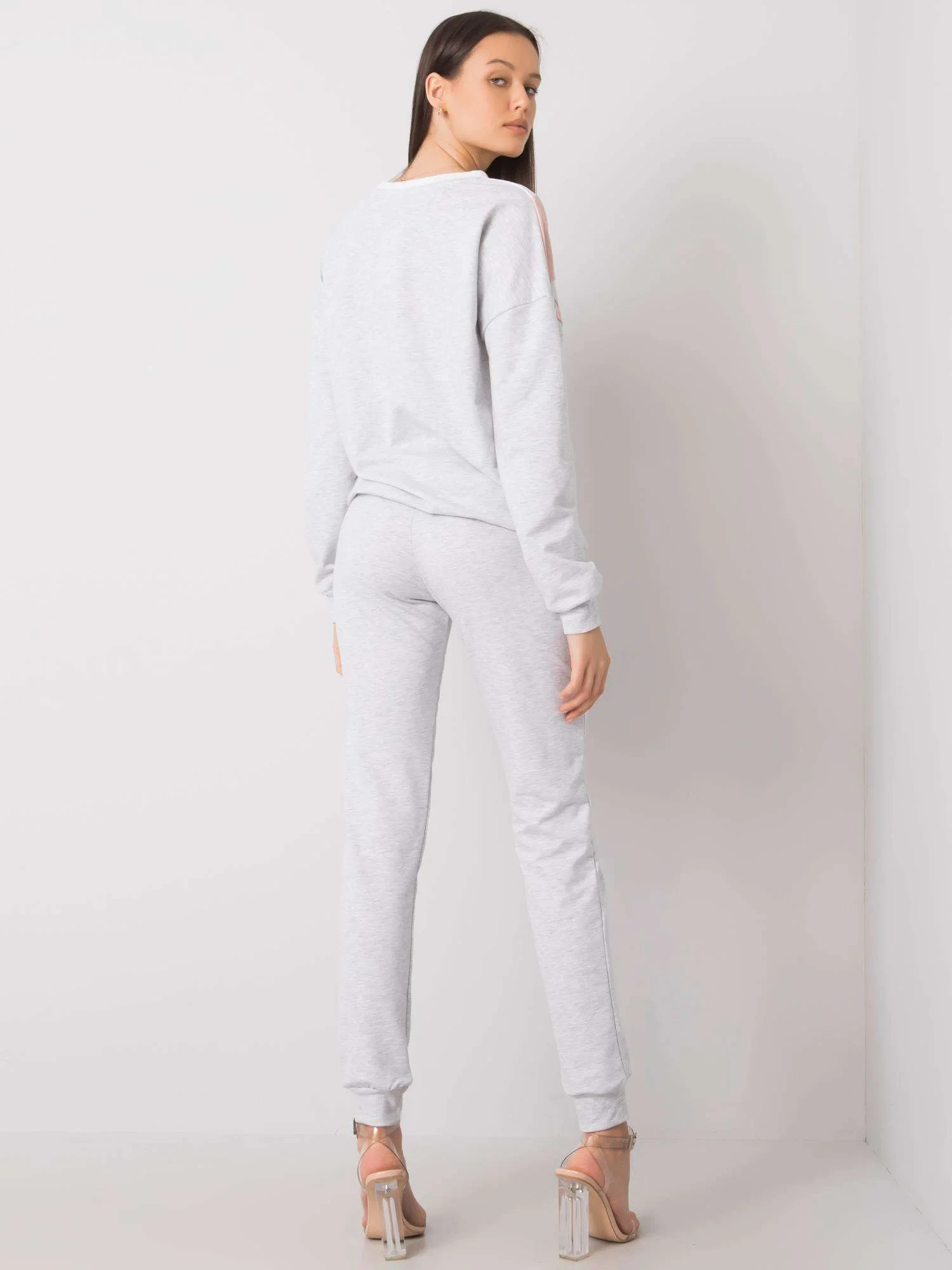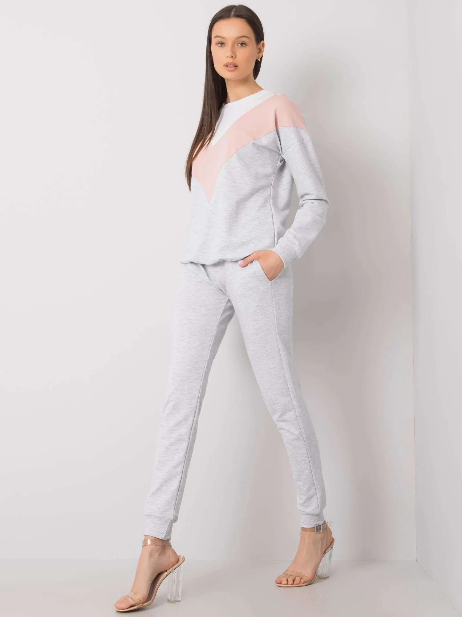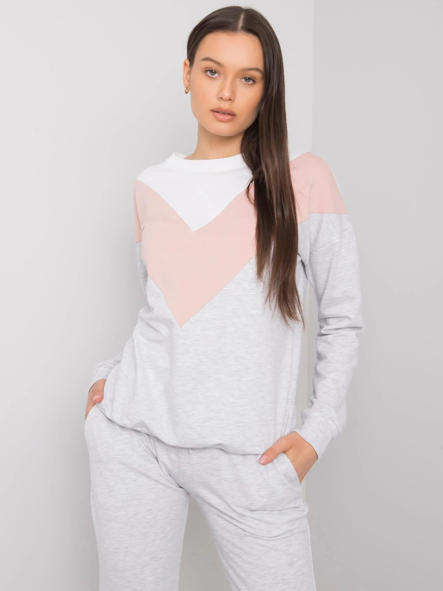 Bílý a špinavě růžový dámský dvoudílný set.