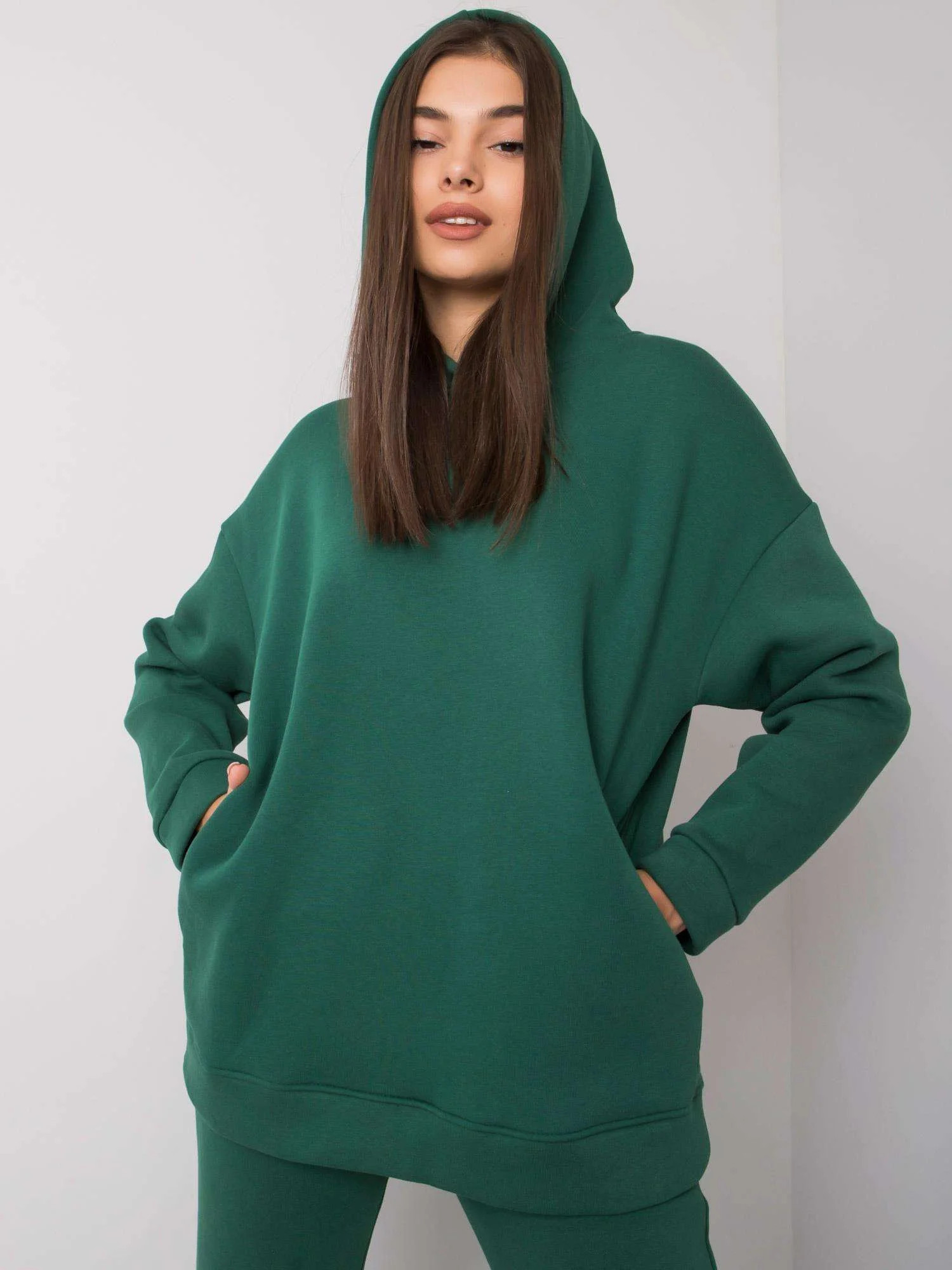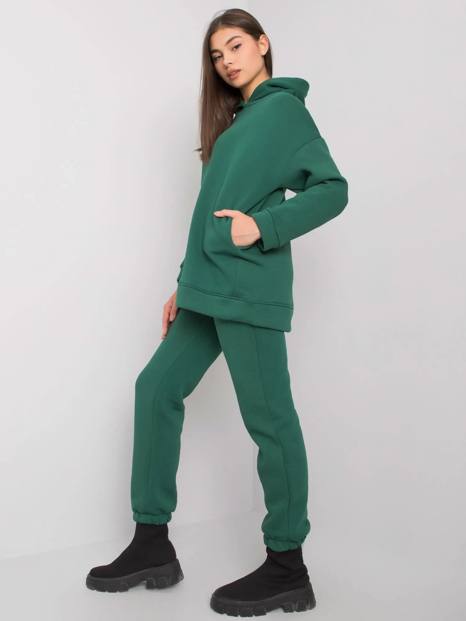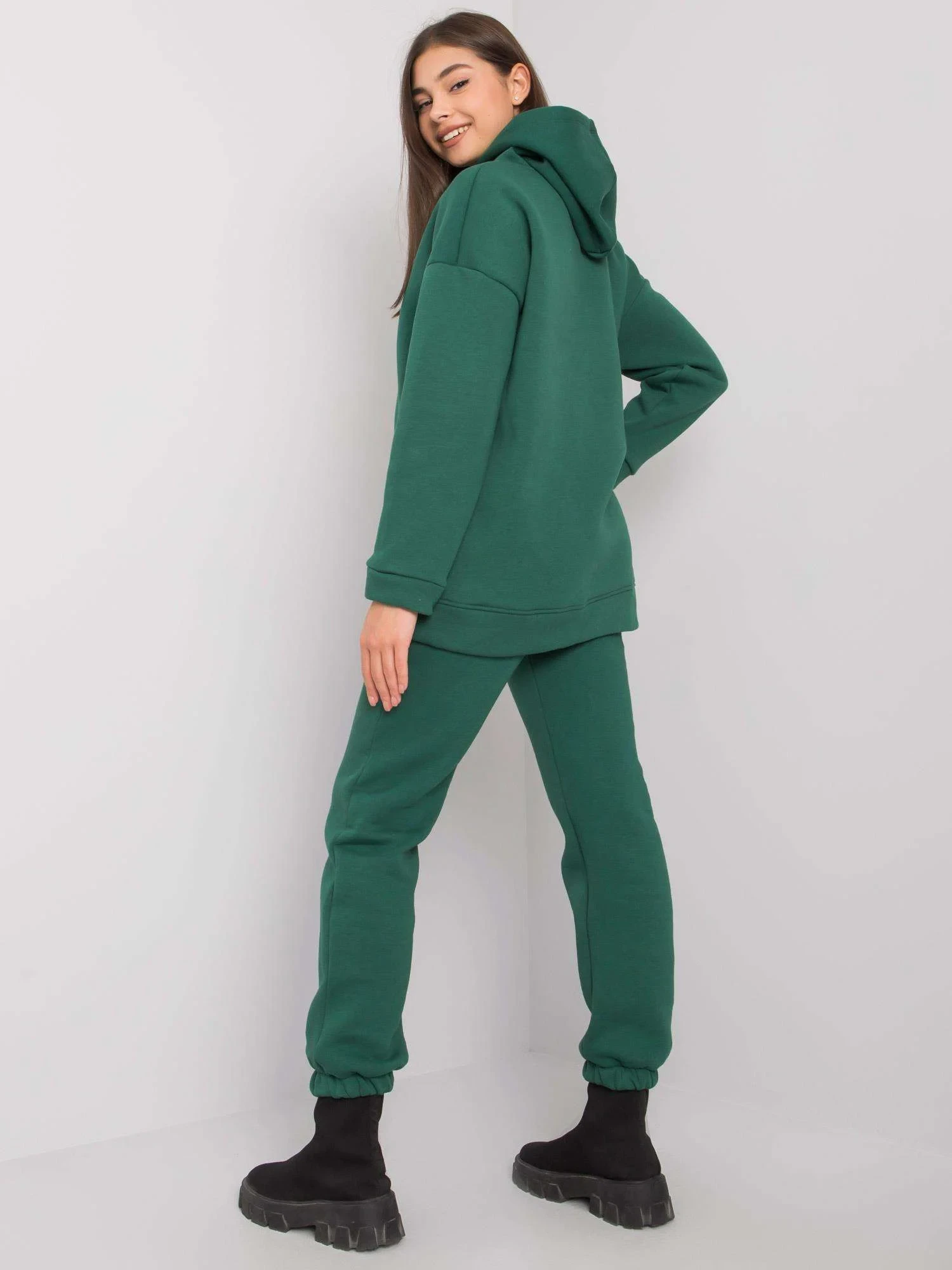 Tmavě zelená tepláková souprava s kalhotami.