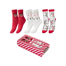 Vánoční dámské ponožky zabalené v roztomilé krabičce jsou ideálním nápadem na dárek. V sadě jsou tři páry s různými zimními vzory, které do šatníku přinesou trochu vánoční atmosféry. Měkké, pohodlné a příjemné na nošení — skvělé na chladné dny a jako stylový vánoční dárek.