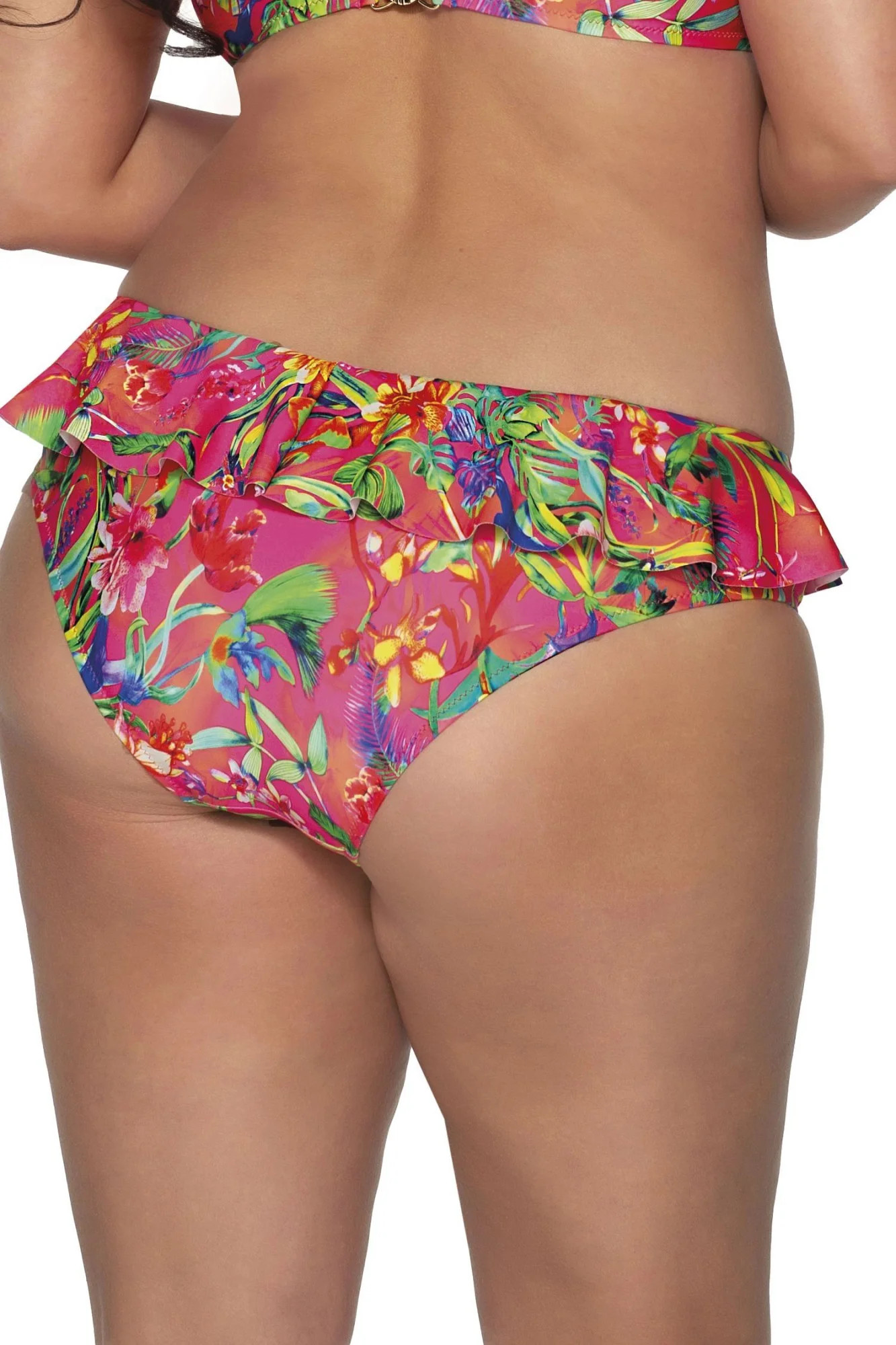 Spodní díl plavek 192/11 Raspberry charm AVA - typ brazilky - elastická látka z barevného mikrovlákna - vnitřní strana podšitá síťovinou - vrchní část zdobená řasením - boky s vázáním