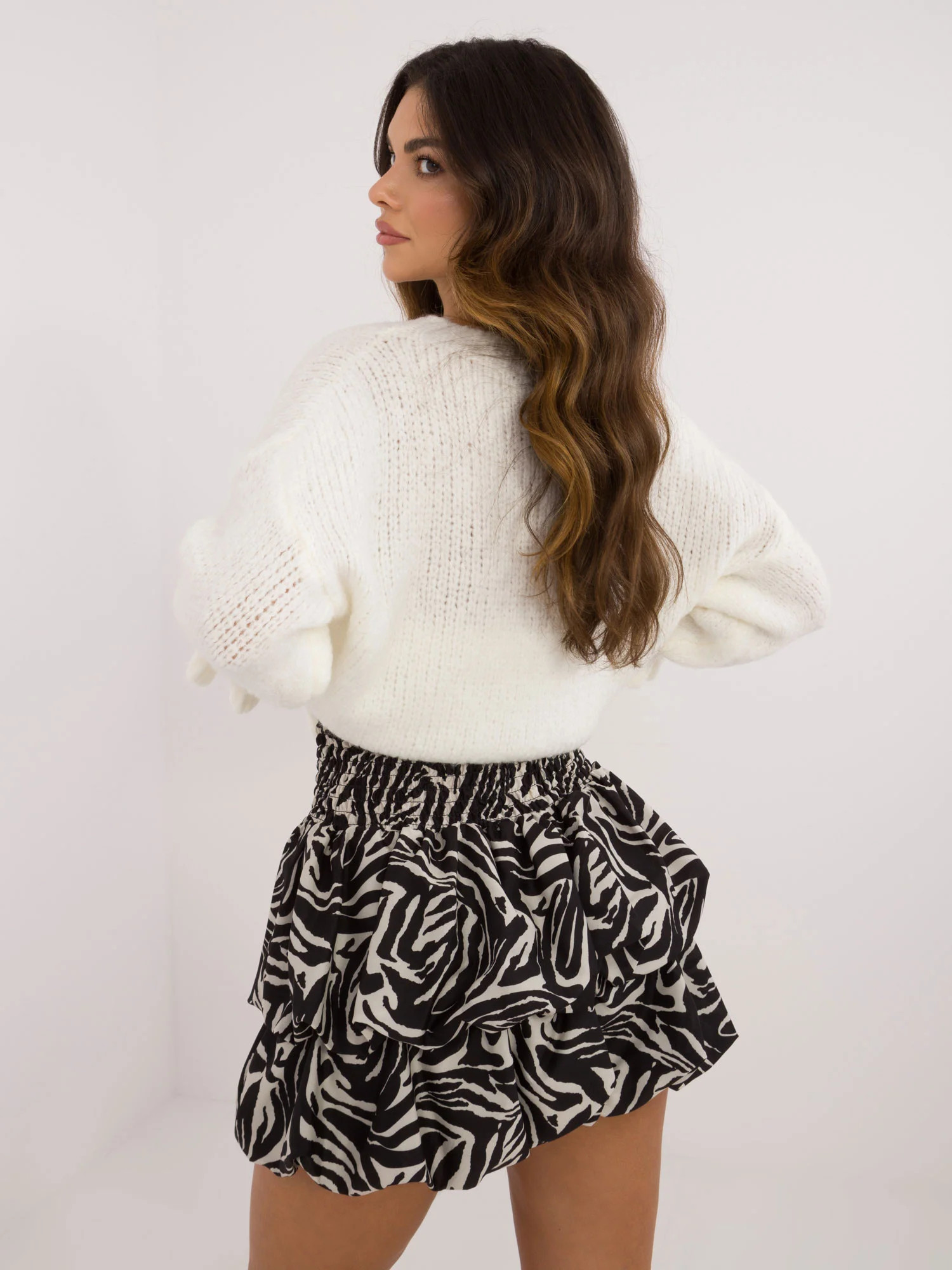 Modelka ma na sobie rozmiar one size. Wymiary modelki: wzrost 173 cm, biust 85 cm, talia 62 cm, biodra 95 cm.