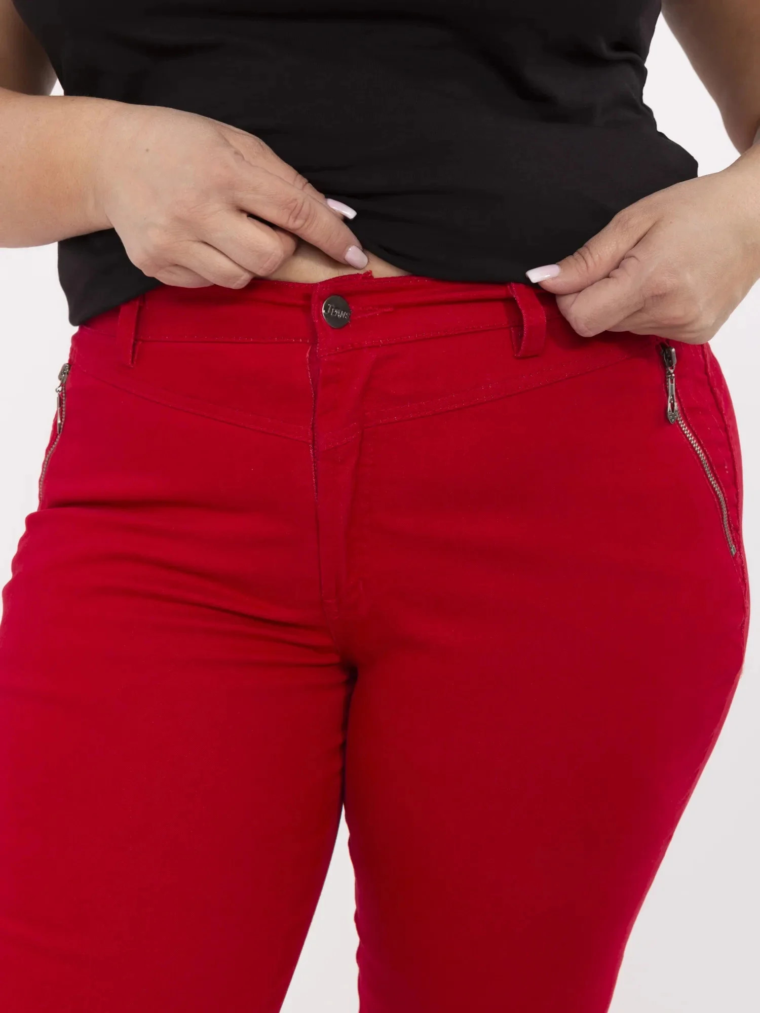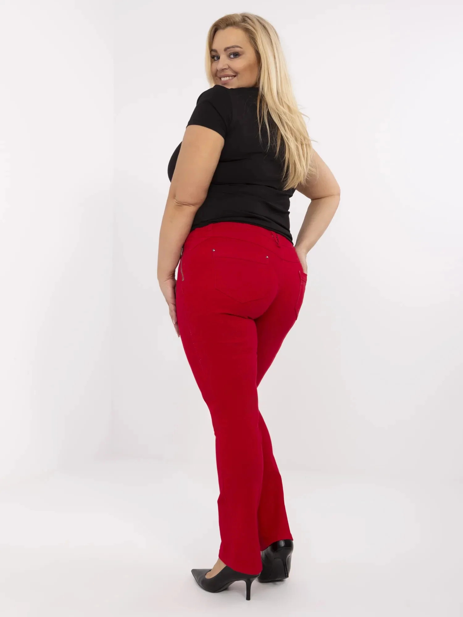 Wymiary spodni w rozmiarze 48 szerokość w pasie (niski stan) - 45 cm (na płasko), szerokość w pasie - 50 cm (po rozciągnięciu), wysokość stanu - 27 cm, szerokość w biodrach – 53,5 cm, długość całkowita – 102 cm.