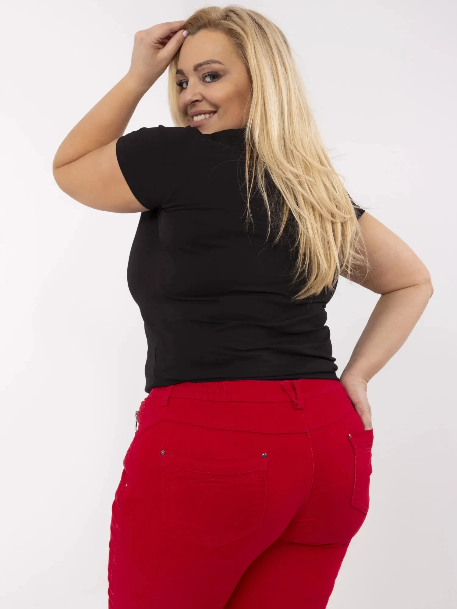 Modelka ma na sobie rozmiar 48. Wymiary modelki: wzrost 167 cm, biust 118 cm, talia 90 cm, biodra 118 cm.