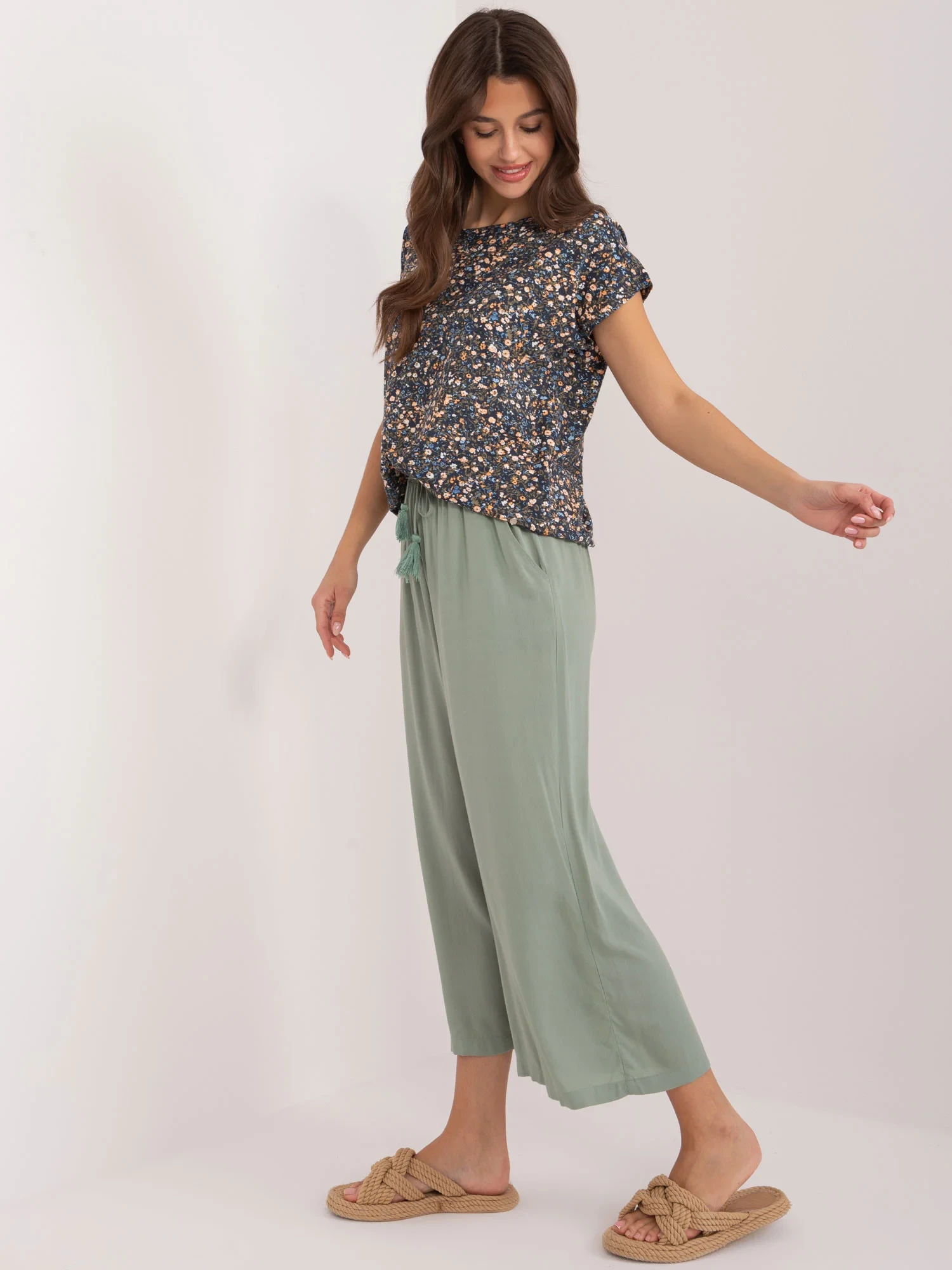 Modelka ma na sobie rozmiar S. Wymiary modelki: wzrost 172 cm, biust 88 cm, talia 63 cm, biodra 92 cm.