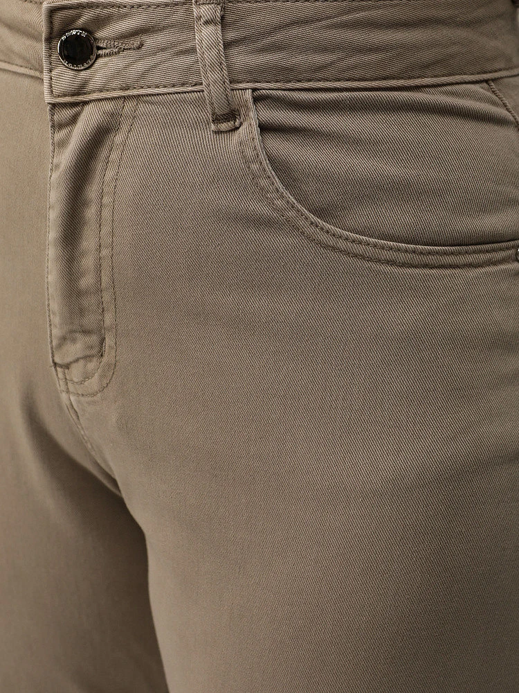 Wysoki stan podkreśla talię, a lekko zwężane nogawki pomagają zachować proporcje sylwetki.