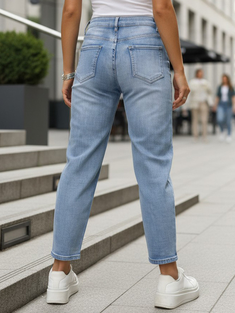 - Krój mom fit - zapewnia wygodę i swobodę noszenia przez cały dzień