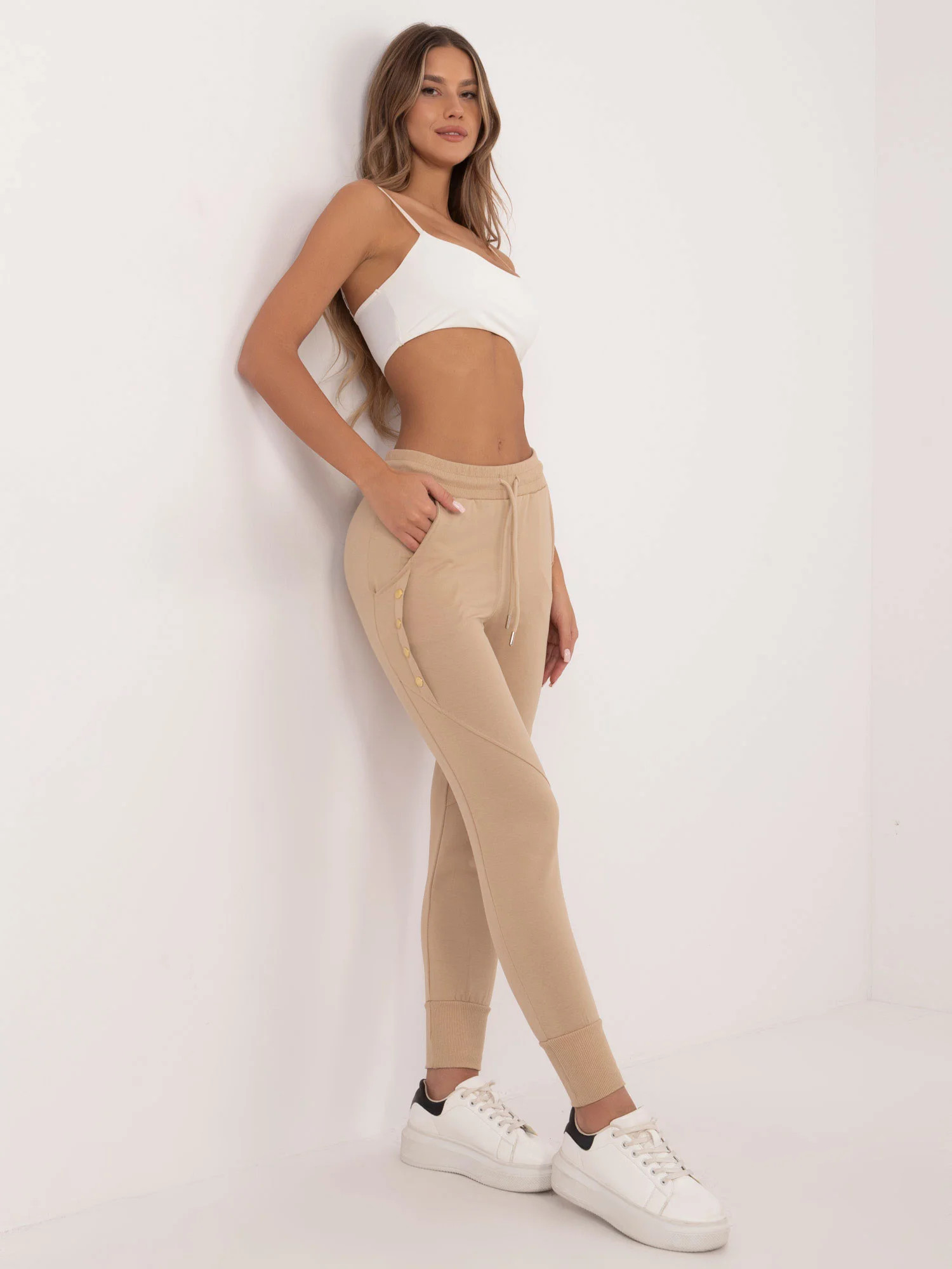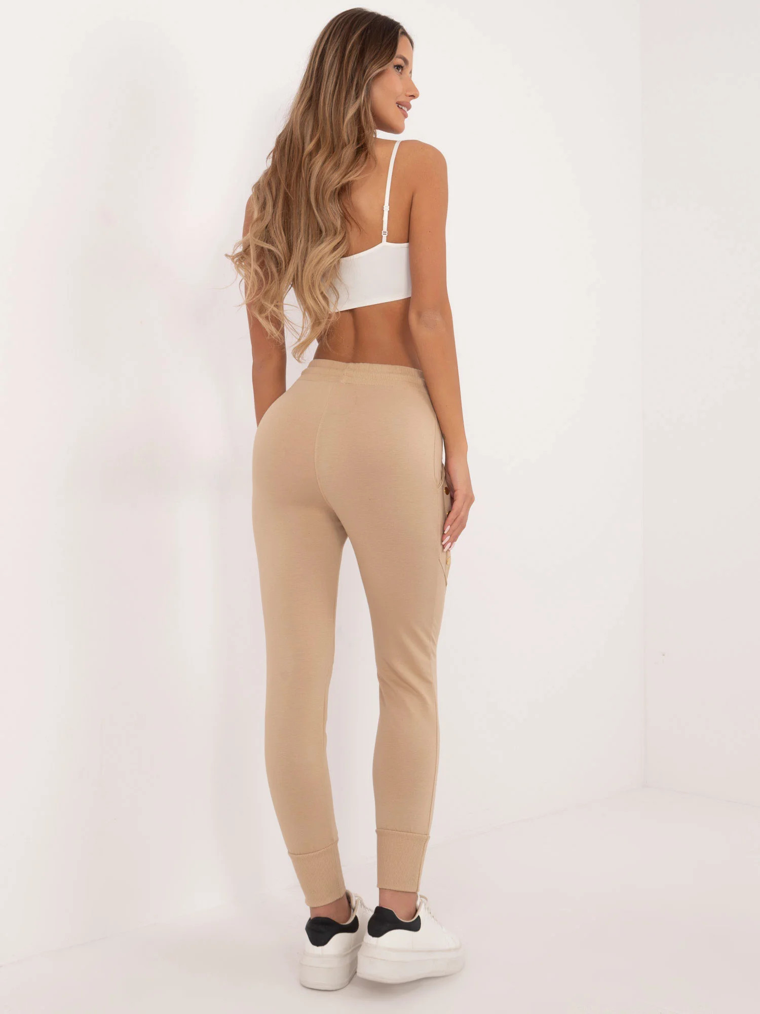 Wymiary spodni w rozmiarze S mierzone na płasko: szerokość spodni w pasie - 33 cm, wysokość stanu - 29 cm, długość spodni - 91 cm