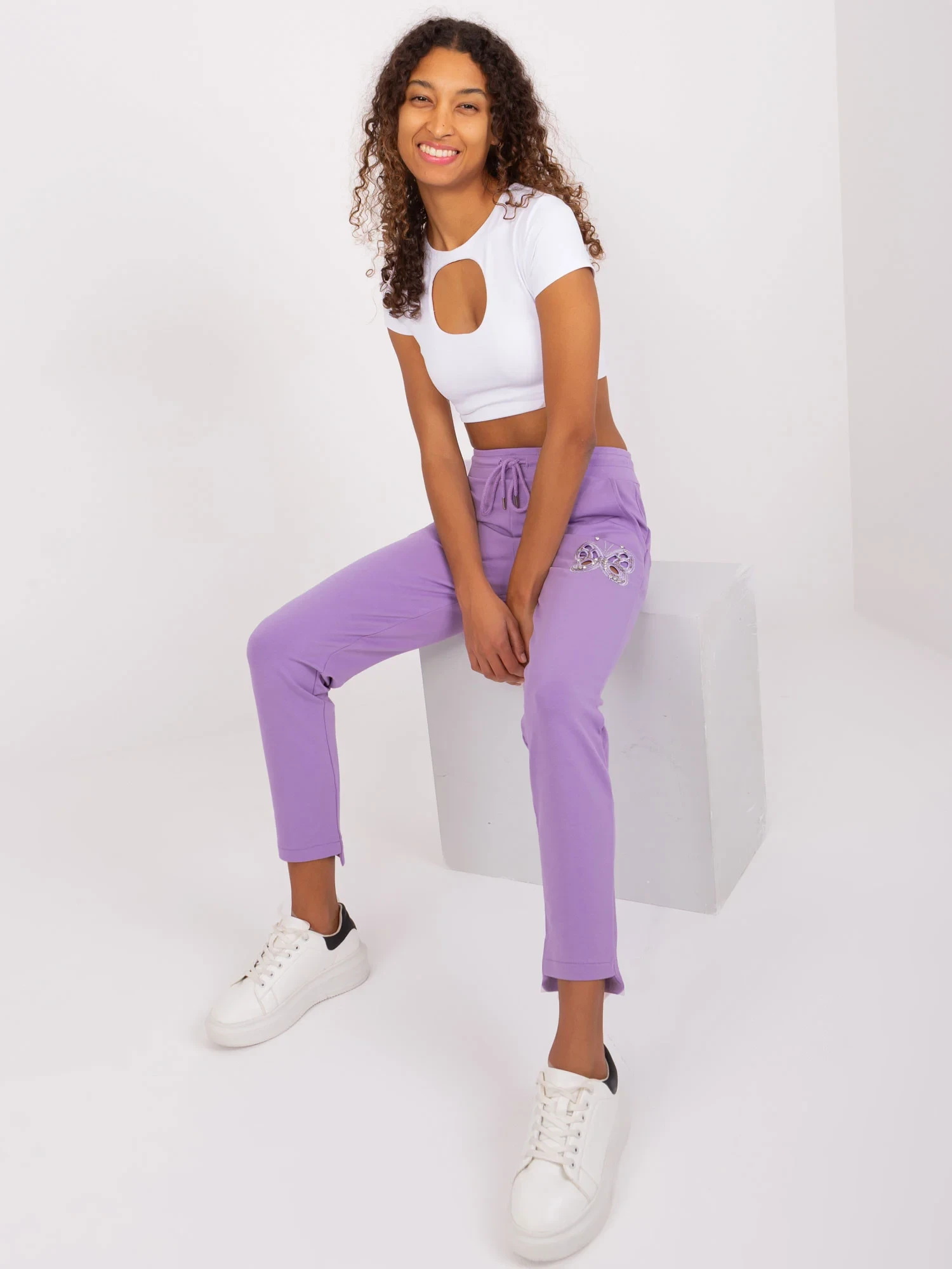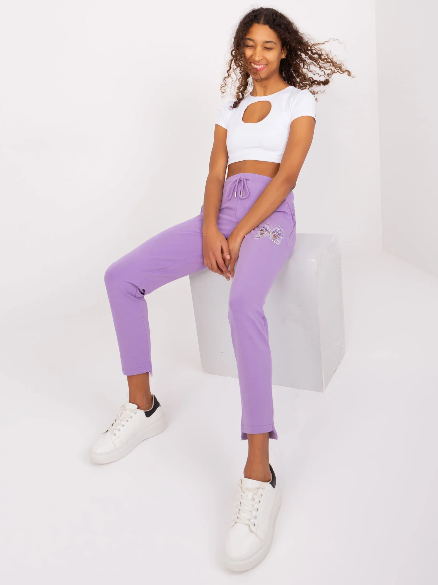 Wymiary spodni w rozmiarze S/M mierzone na płasko: szerokość w pasie - 38 cm, długość spodni - 94 cm, wysokość stanu - 28 cm.