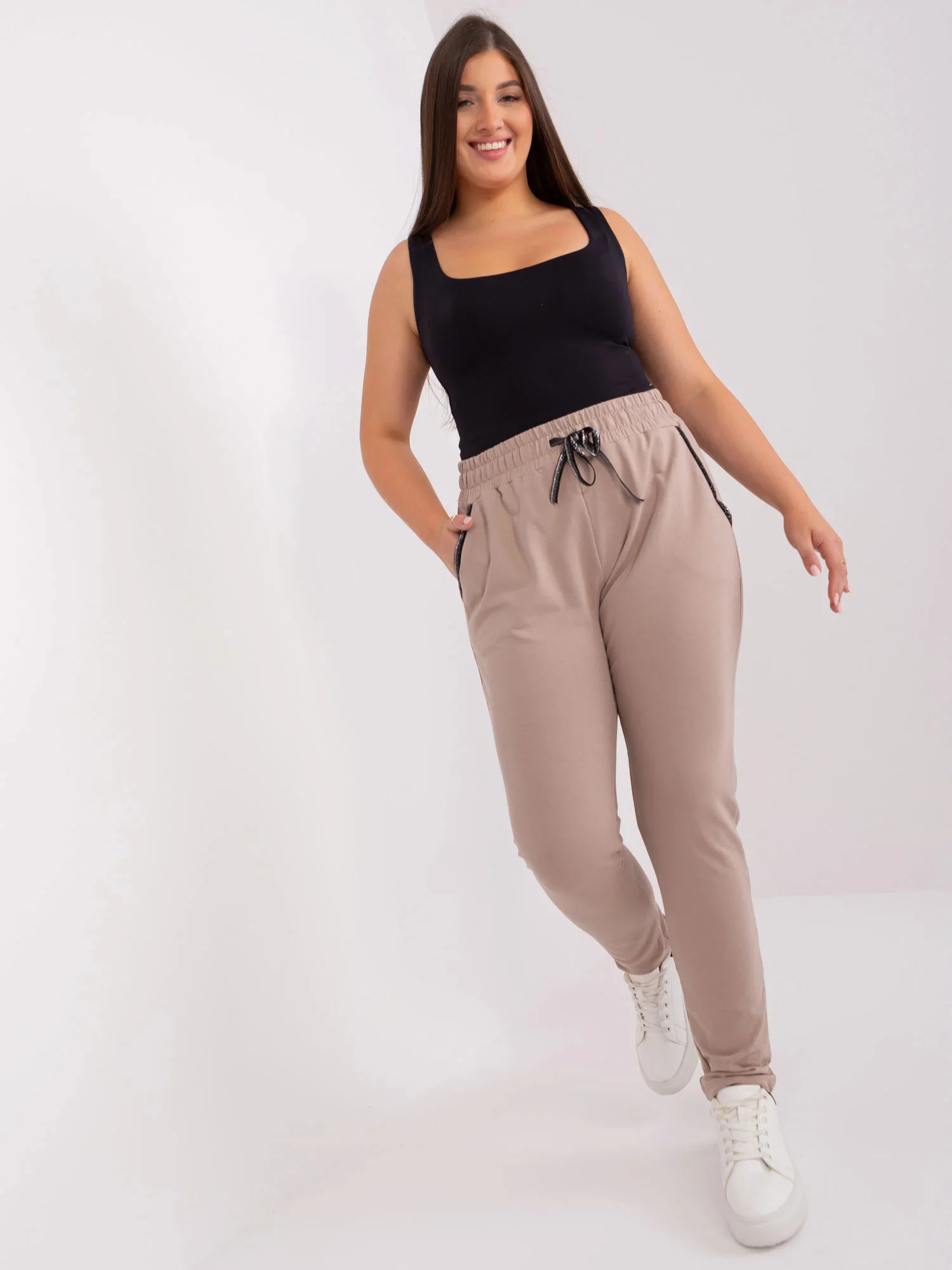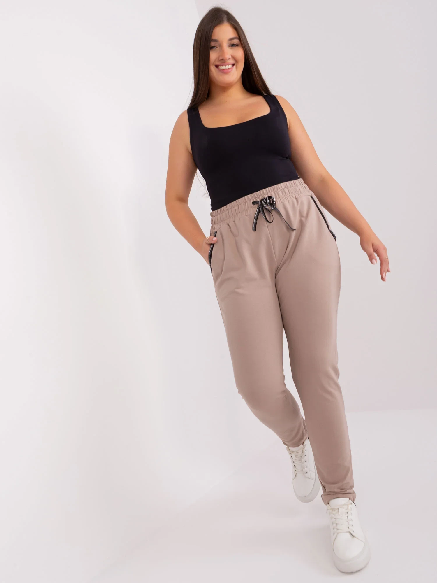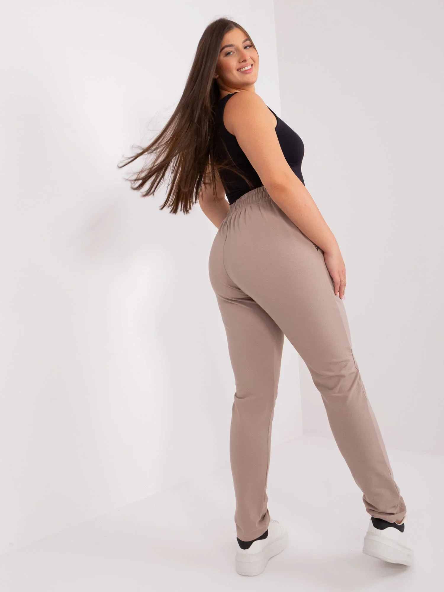Wymiary spodni w rozmiarze 2XL mierzone na płasko: szerokość w pasie - 44 cm, wysokość stanu - 36 cm, długość całkowita - 105 cm.