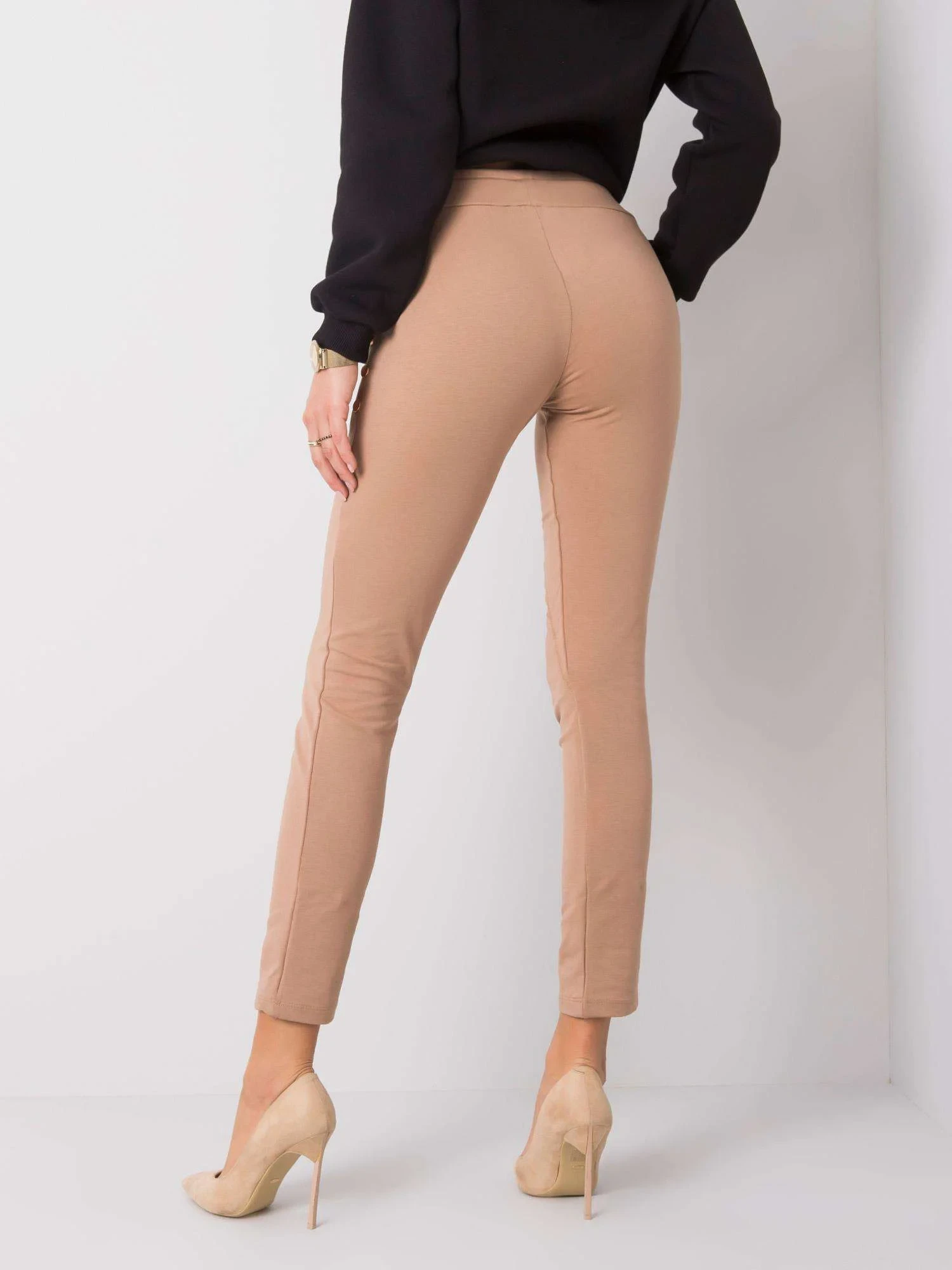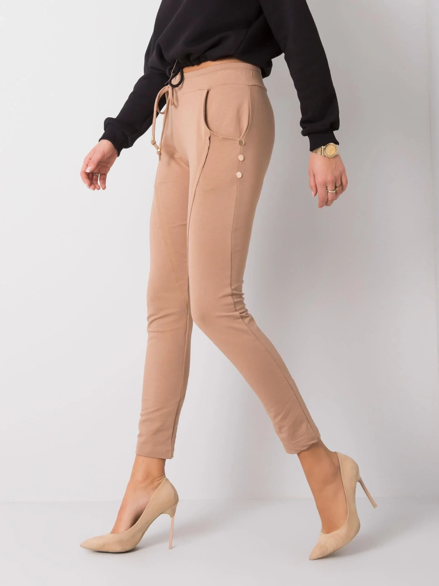 Camelowe spodnie z troczkami.