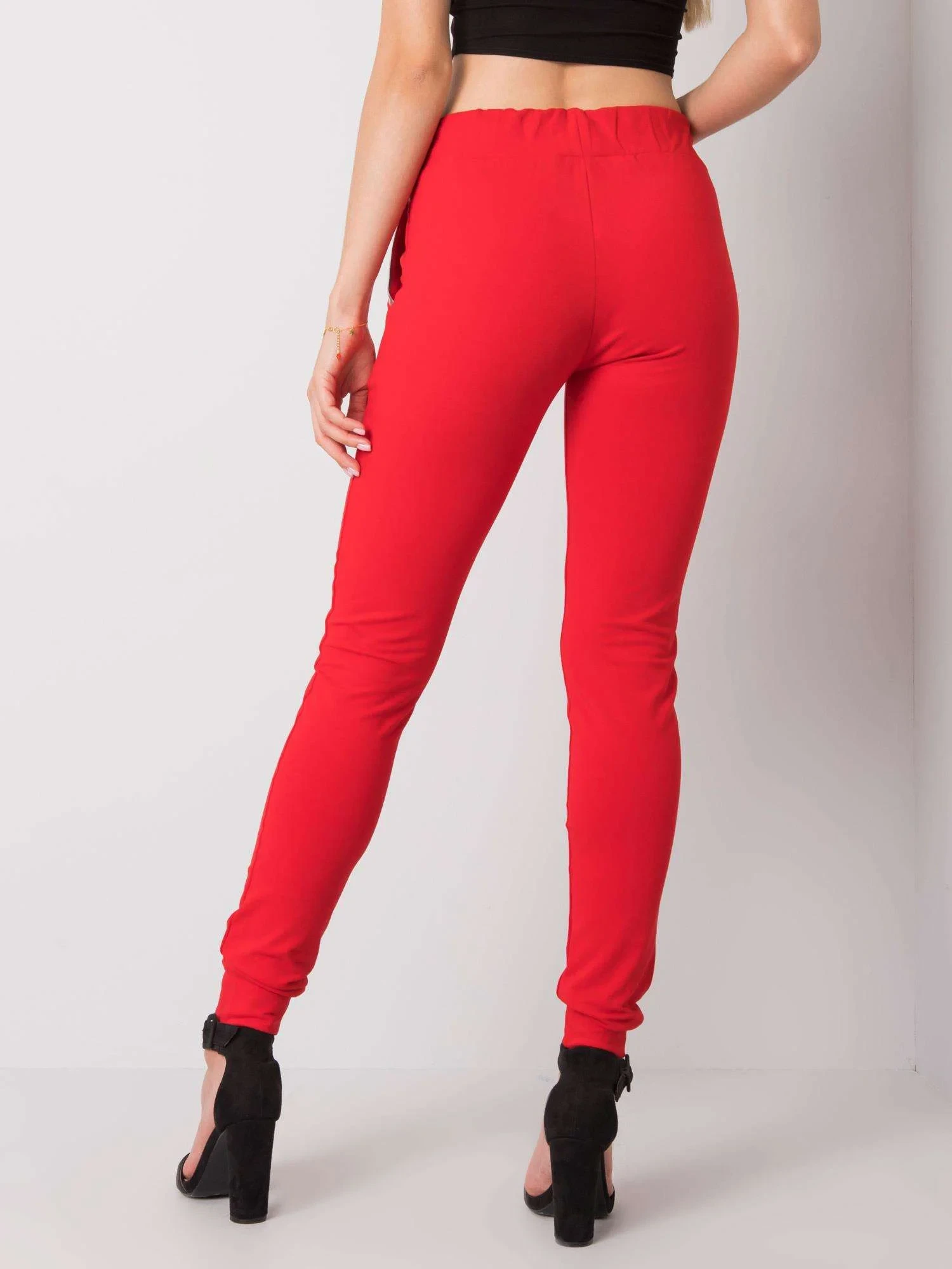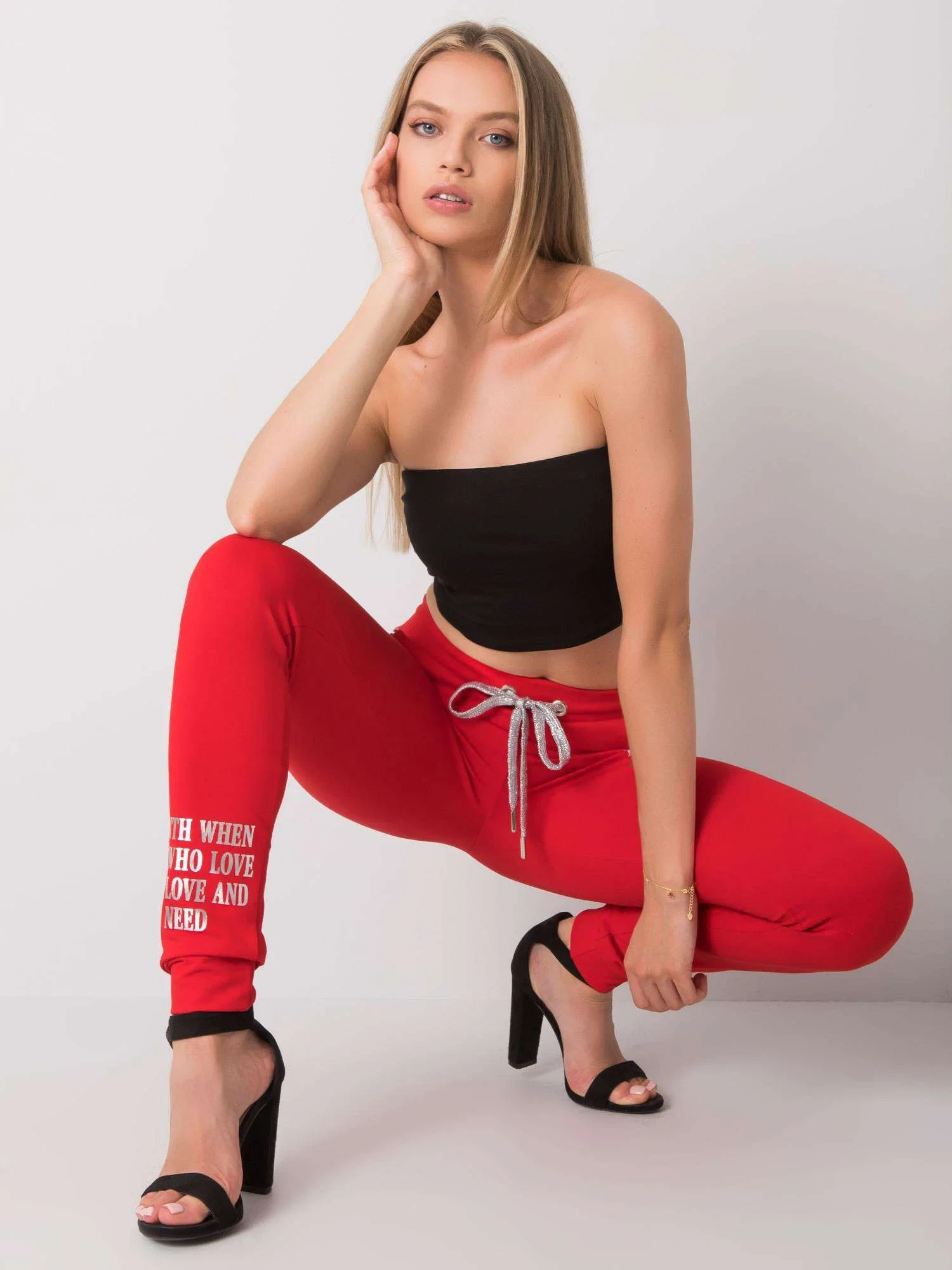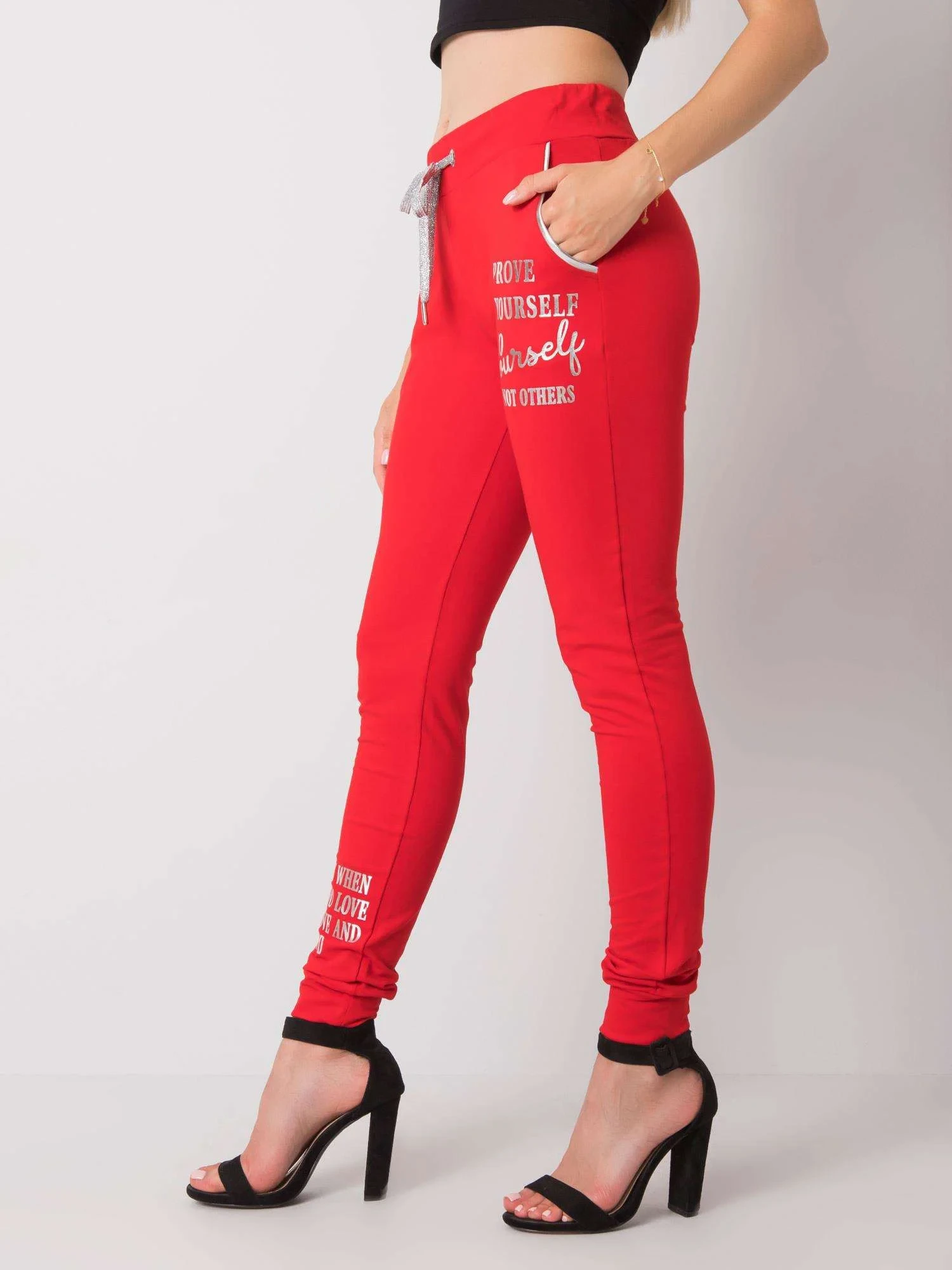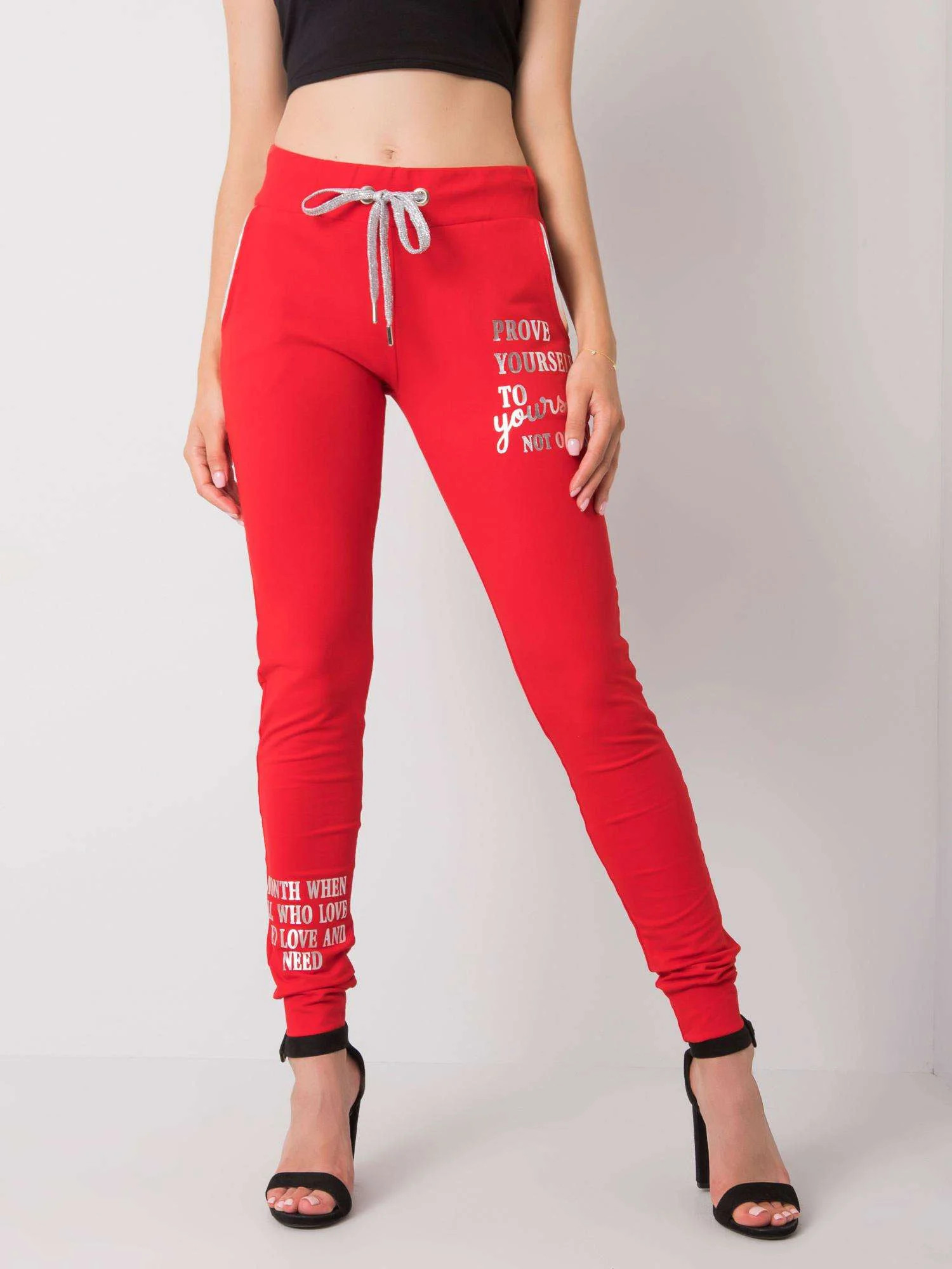 Czerwone damskie spodnie dresowe z napisem.
