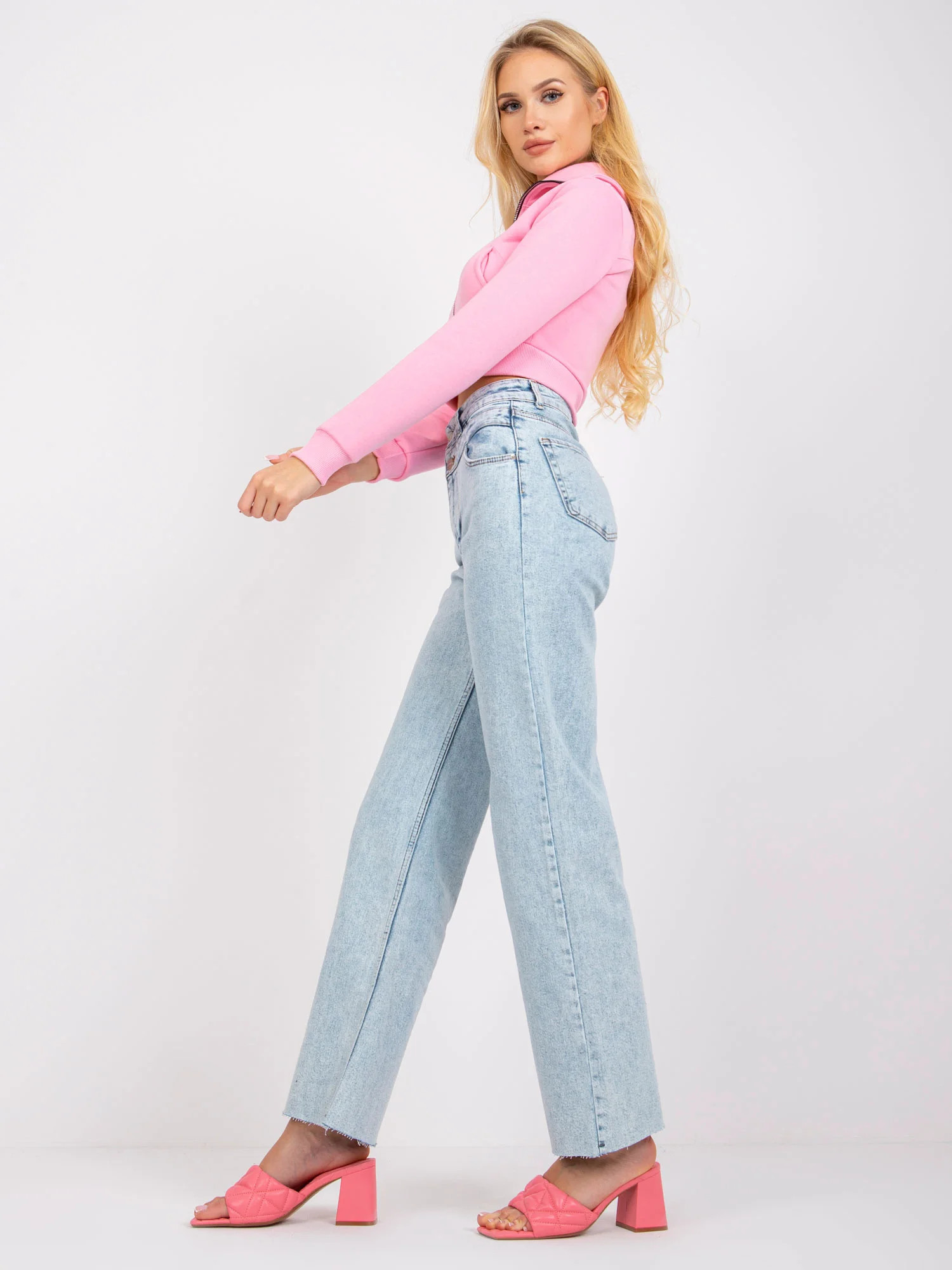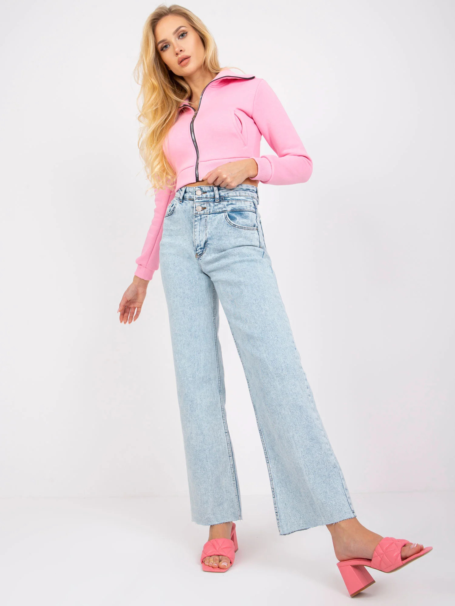 Modelka ma na sobie rozmiar 27. Wymiary modelki: wzrost 175 cm, biust 84 cm, talia 62 cm, biodra 93 cm.
