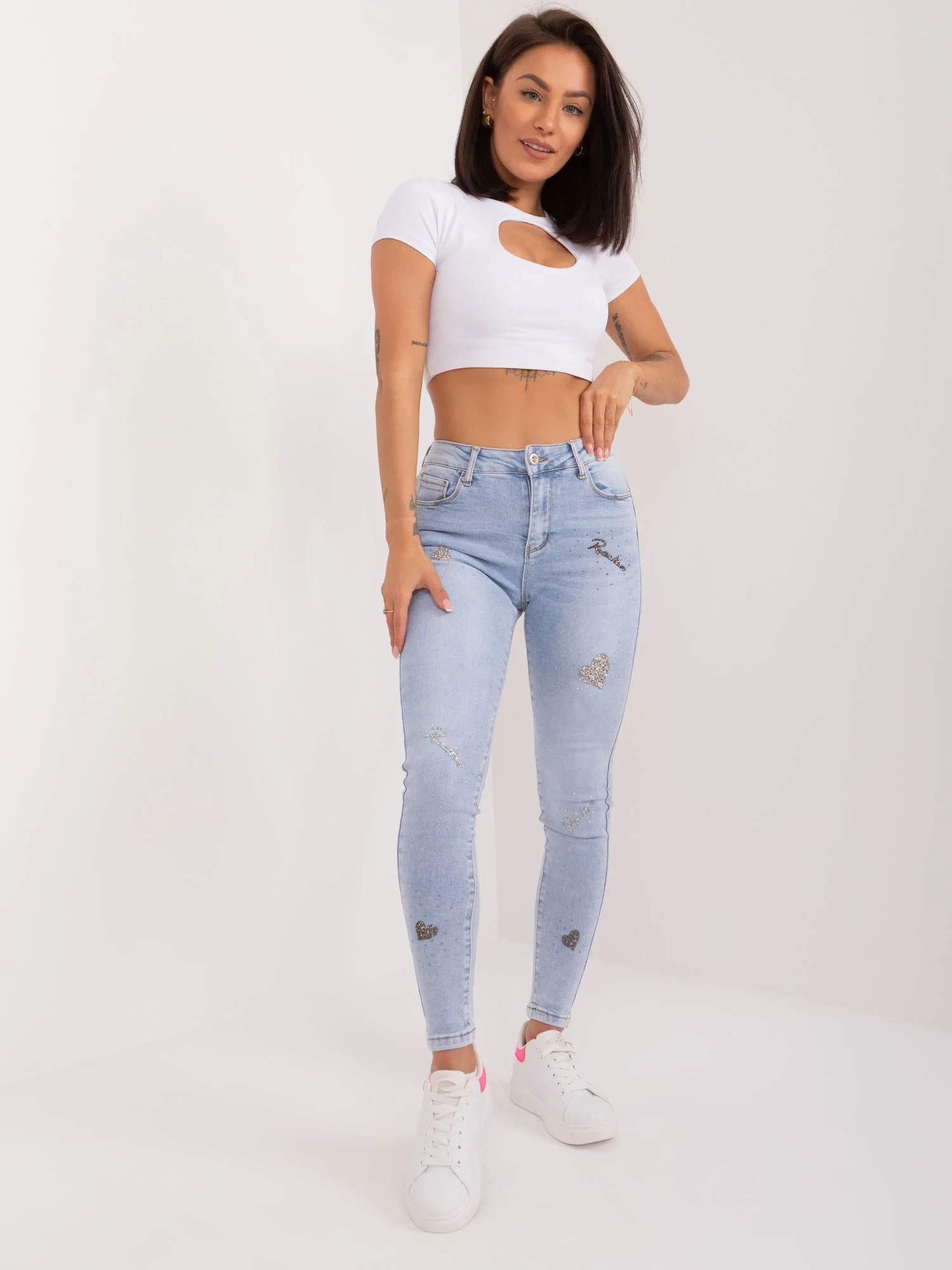 Modelka ma na sobie rozmiar 27. Wymiary modelki: wzrost 164 cm, biust 88 cm, talia 62 cm, biodra 90 cm.