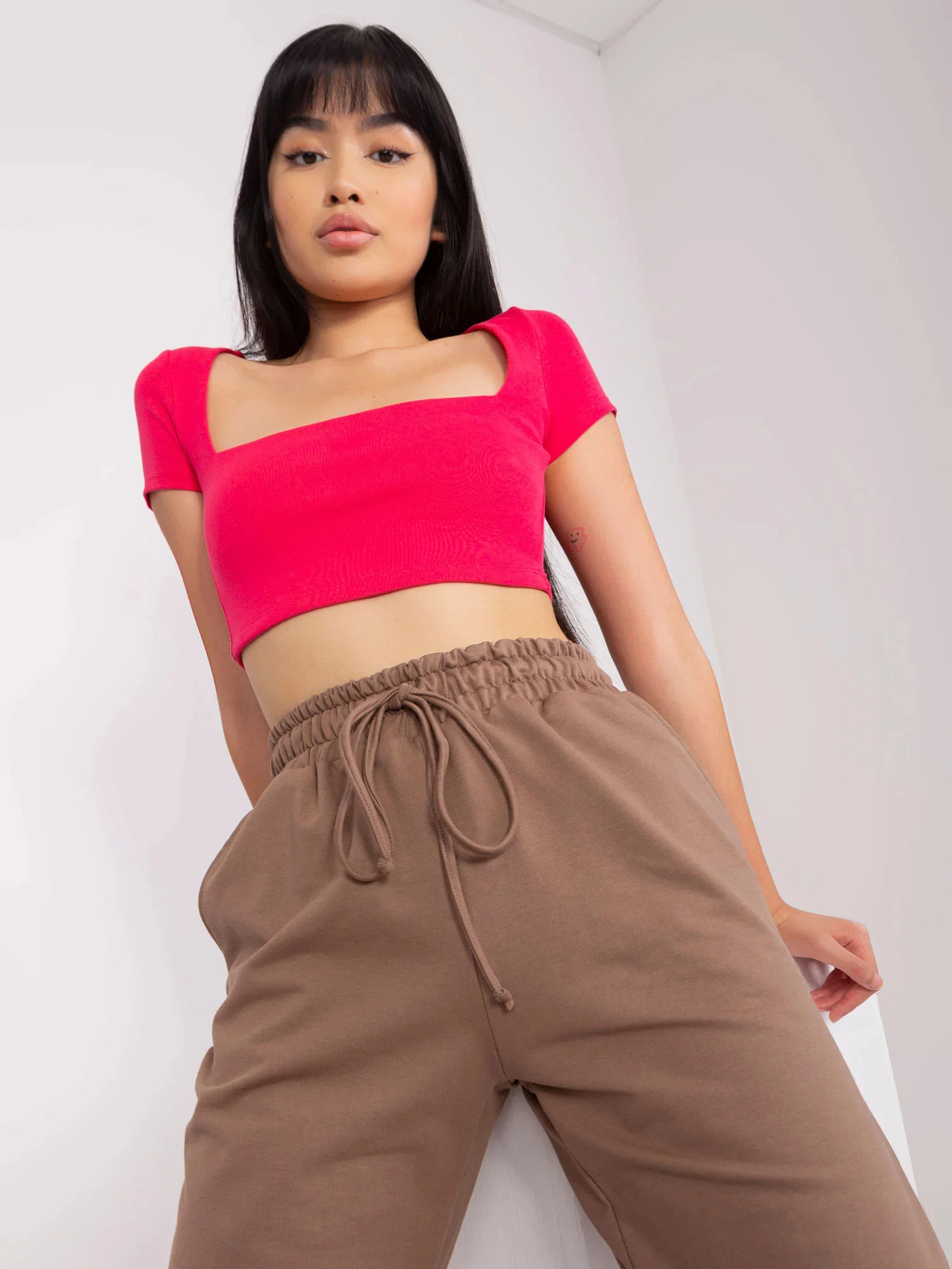 Modelka ma na sobie rozmiar S/M. Wymiary modelki: wzrost 167 cm, biust 73 cm, talia 64 cm, biodra 91 cm.
