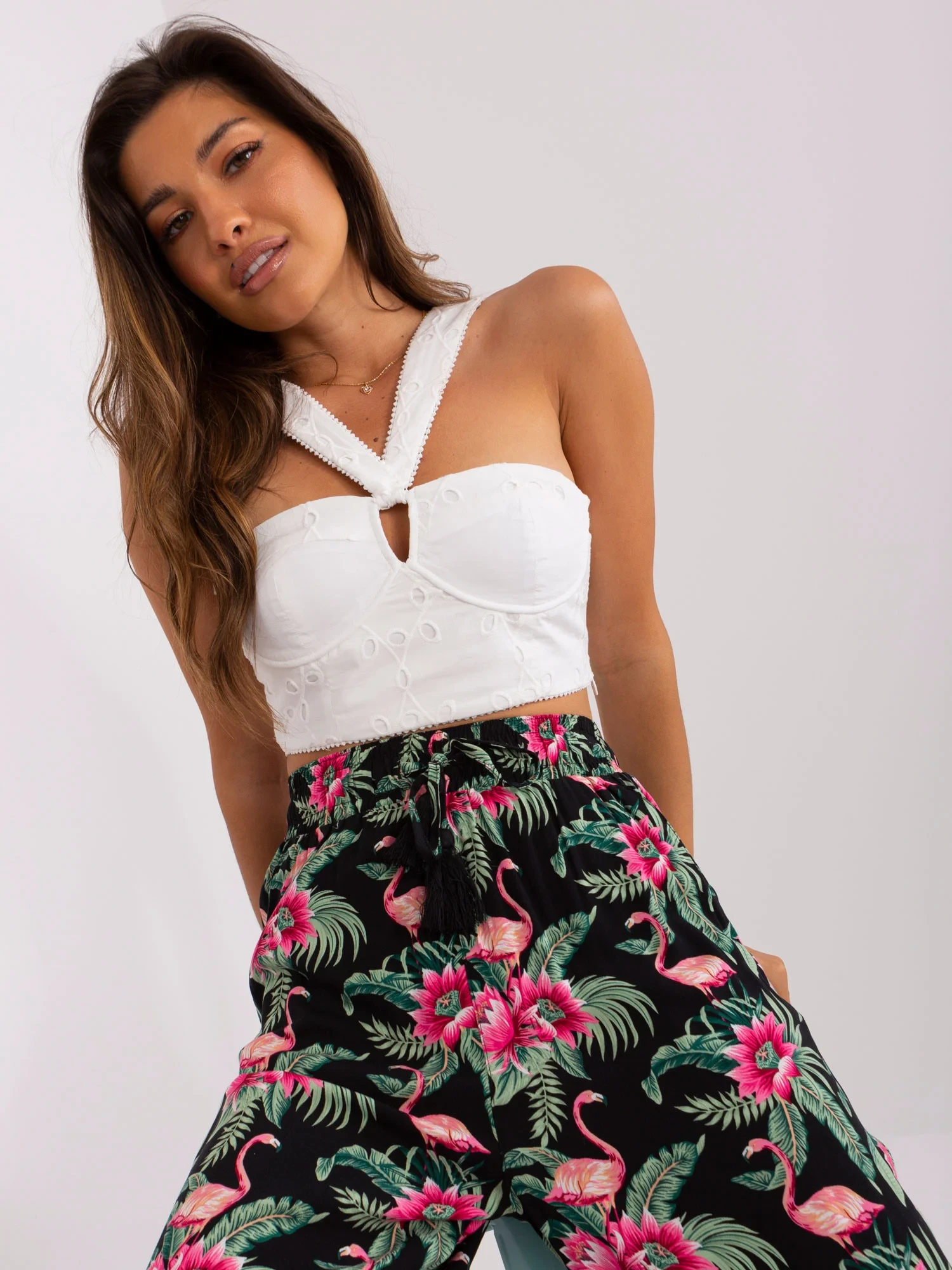 Modelka ma na sobie rozmiar S. Wymiary modelki: wzrost 173 cm, biust 89 cm, talia 65 cm, biodra 91 cm.