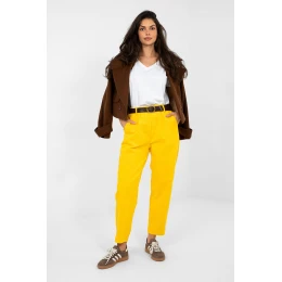 Kalhoty typu mrkev z žíněného žakardu jsou pohodlným a stylovým návrhem pro každodenní i pracovní styling v uvolněném, ležérním provedení. Vyrobené z kombinace bavlny s přídavkem elastanu poskytují pohodlí nošení, pružnost a dobrou střihovou přiléhavost. Hladký vzor a zúžené nohavice s délkou 7/8 dodávají celku moderní charakter. Model s vysokým pasem s elastickým gumovým lemem v pase zaručuje pohodlí po celý den a je navíc vybaven zapínacím páskem, který zdůrazňuje pas. Boční, zasouvací kapsy zvyšují funkčnost kalhot. Absence klasického zapínání zajišťuje, že kalhoty jsou snadno nasazovatelné a skvěle se hodí jak do každodenních outfitů, tak do pracovních stylizací.