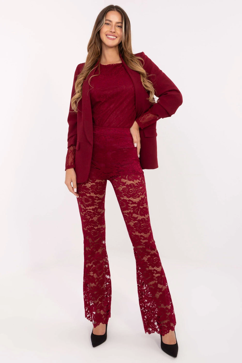 Elegantní zvonové krajkové kalhoty, které spojují eleganci s výjimečným ženským charakterem. Vyrobené z vysoce kvalitní směsi polyesteru, elastanu a viskózy, jsou lehké, příjemné na dotek a zaručují pohodlné nošení. Model má vysoký pas s vsazenou gumou, co zaručuje ideální přizpůsobení postavě, a široké zvonové nohavice dodávají kalhotám lehkost a efektní vzhled. Celkový dojem je z ažurového materiálu s podšívkou v horní části, co zaručuje pohodlí a diskrétní krytí, zachovávající elegantní charakter kalhot. Absence zapínání a kapes zdůrazňuje jednoduchost a elegantní styl. Skvělá volba na společenské události a večírky, kdy chcete vypadat efektně a žensky.