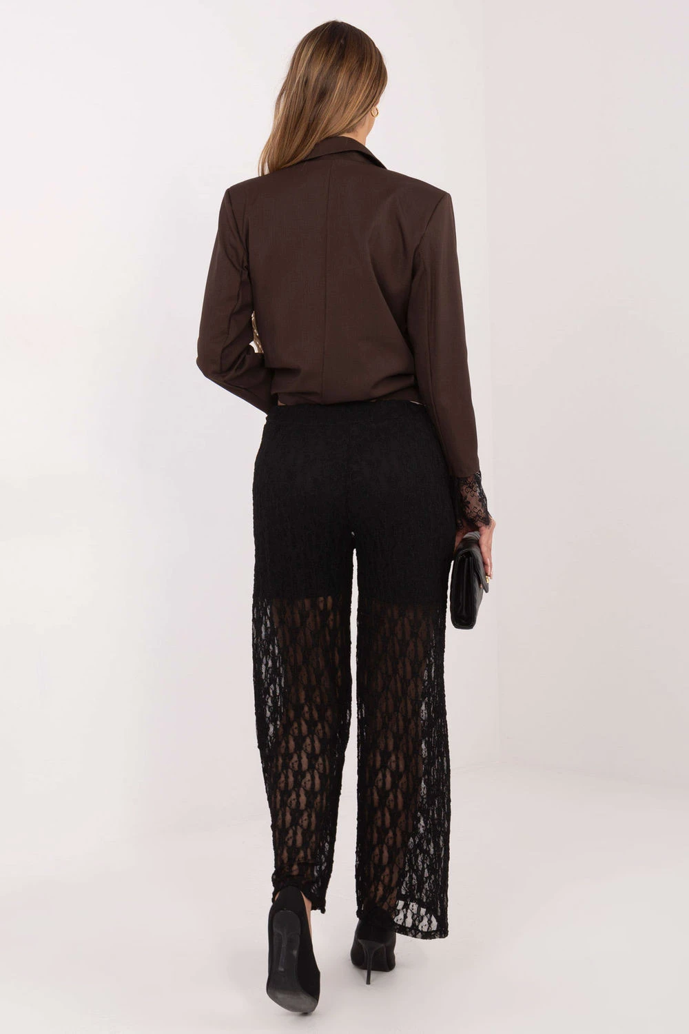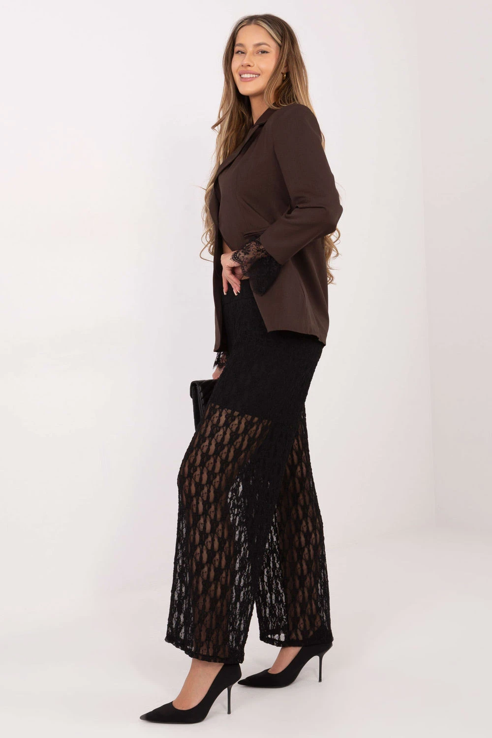 Elegantní krajkové široké kalhoty pro ženy jsou stylovým návrhem, který se skvěle hodí jak na každý den, tak i na formální nebo společenské události. Model kombinuje pohodlí nošení s výjimečným ženským designem. Kalhoty jsou vyrobeny ze směsi viskózy a elastanu, co zajišťuje měkkost, pružnost a pohodlné přizpůsobení se postavě. Různorodá struktura materiálu dodává celku elegantní charakter a zdůrazňuje dekorativní styl krajky. Vysoký pas a elastický pás krásně zdůrazňují pas a zaručují pohodlí po celý den. Široké nohavice ve stylu wide leg opticky prodlužují nohy a dodávají postavě lehkost. Model bez zapínání, nasazovaný přes boky, je praktický a pohodlný v nošení. Podšívka v horní části zajišťuje dostatečné krytí a pohodlí nošení, aniž by narušovala jemný vzhled materiálu. Jedná se o skvělou volbu pro ženy, které chtějí spojit eleganci s moderním střihem a pohodlím.