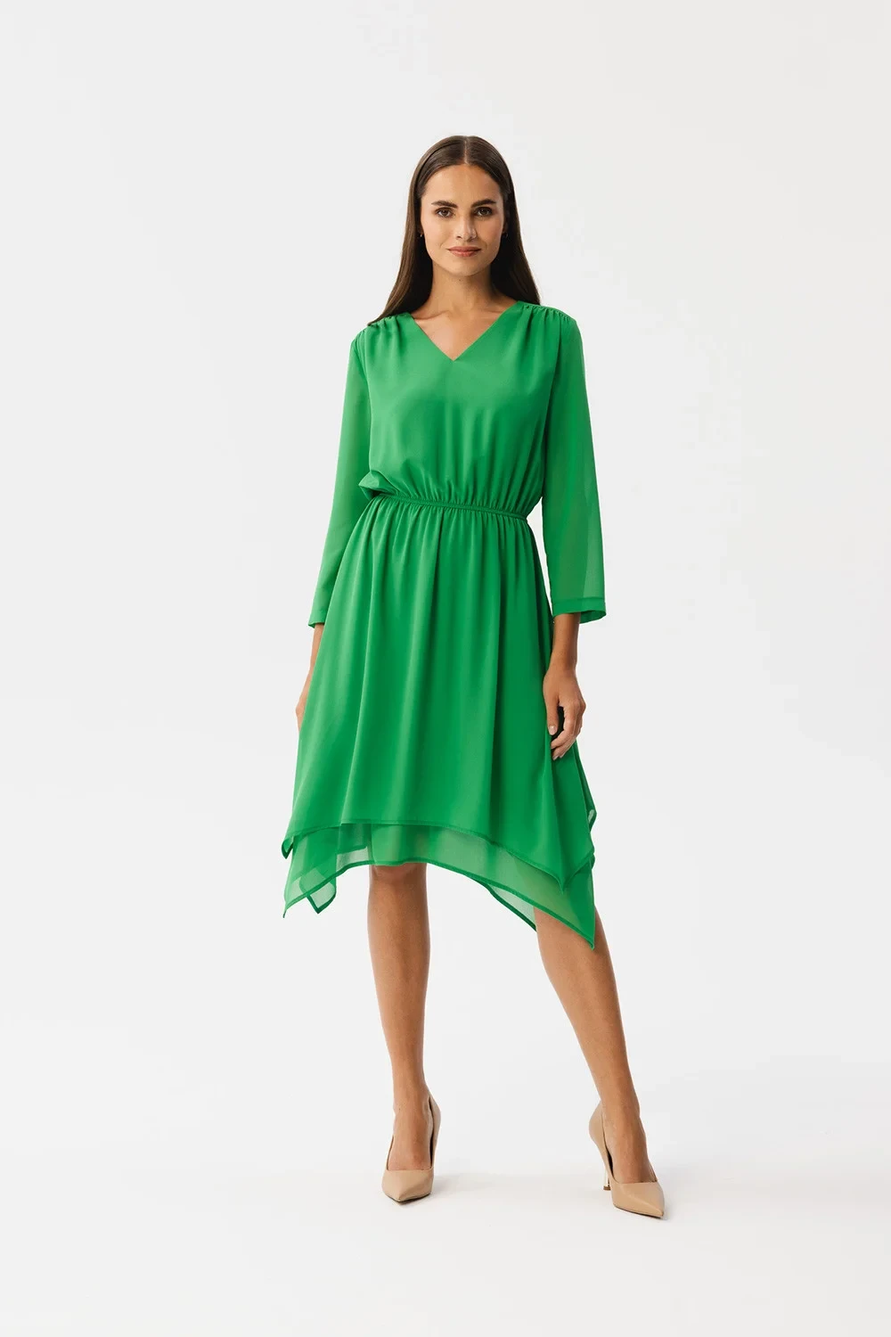 Zde jsou krásné šaty z jemného šifonu, který jim dodává lehkost a jemnost. Šaty mají asymetrický vrstvený lem, který jim dodává originalitu a lehkost. Výstřih ve tvaru písmene V je elegantní a klasický. Guma v pase zvýrazňuje pas a zároveň poskytuje pohodlí. Rukávy v délce 7/8 dodávají šatům moderní nádech. Délka šatů sahá nad kolena, což jim dává univerzálnost pro různé příležitosti. Částečně podšité pro větší pohodlí a správné zakončení. Šaty se skvěle hodí na všechny výlety, večírky nebo setkání s přáteli, kterým dodají na jemnosti a eleganci. Navrženo a ušito v Polsku.