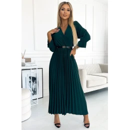 Plisované šaty Serena s výstřihem, černým páskem a 3/4 rukávy, vyrobené z hladké zelené látky. Ideální šaty pro každou příležitost. Značka numoco basic. Evropská výroba.