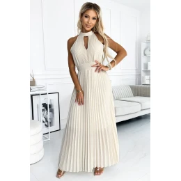 Plisované šifonové midi šaty s výřezem ve tvaru slzy ve výstřihu a hlubokým výstřihem na zádech. Šaty v béžové barvě. Značka numoco. Evropská výroba.