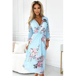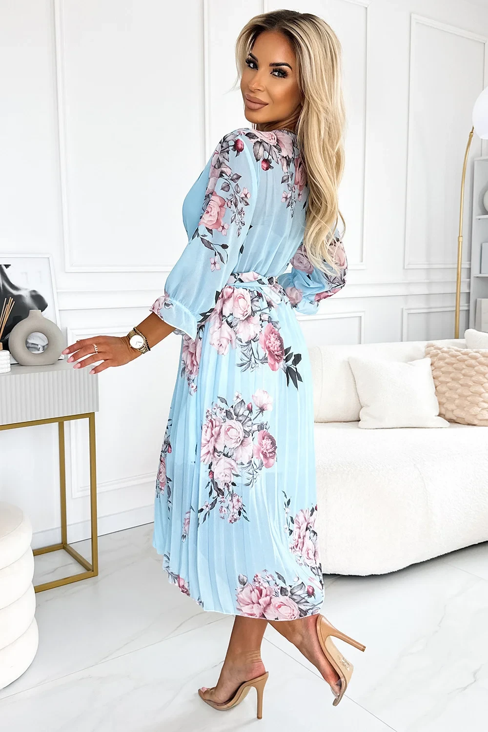 Šifonové plisované midi šaty s výstřihem a páskem. Materiál růžové růže na modrém pozadí. Značka numoco basic. Evropská výroba.