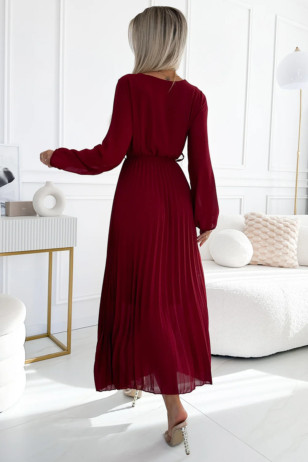 Plisované šifónové šaty s překrytým výstřihem, dlouhým rukávem a vázaným páskem. Vyrobeno z lehkého materiálu v bordové barvě. Ideální šaty na každou příležitost. Značka Numoco Basic. Evropská výroba.