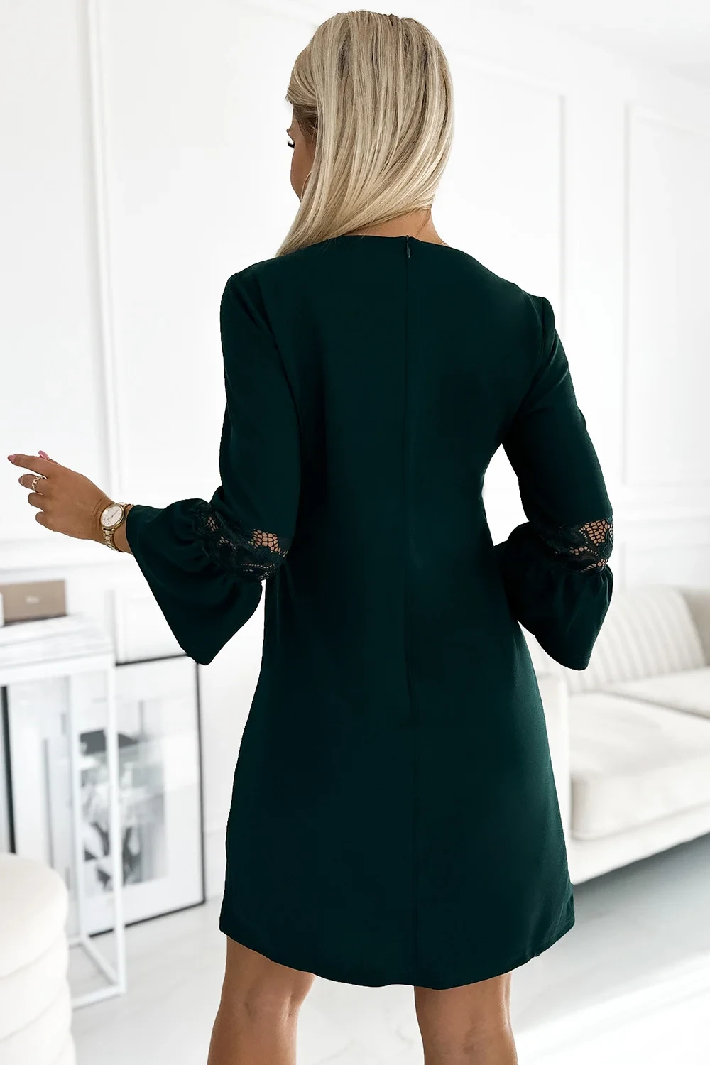 Šaty Margaret s rozšířenými rukávy a krajkovou vsadkou, velmi pohodlné a neomezující. Šaty v tmavě zelené barvě. Značka numoco. Vyrobeno v Polsku.