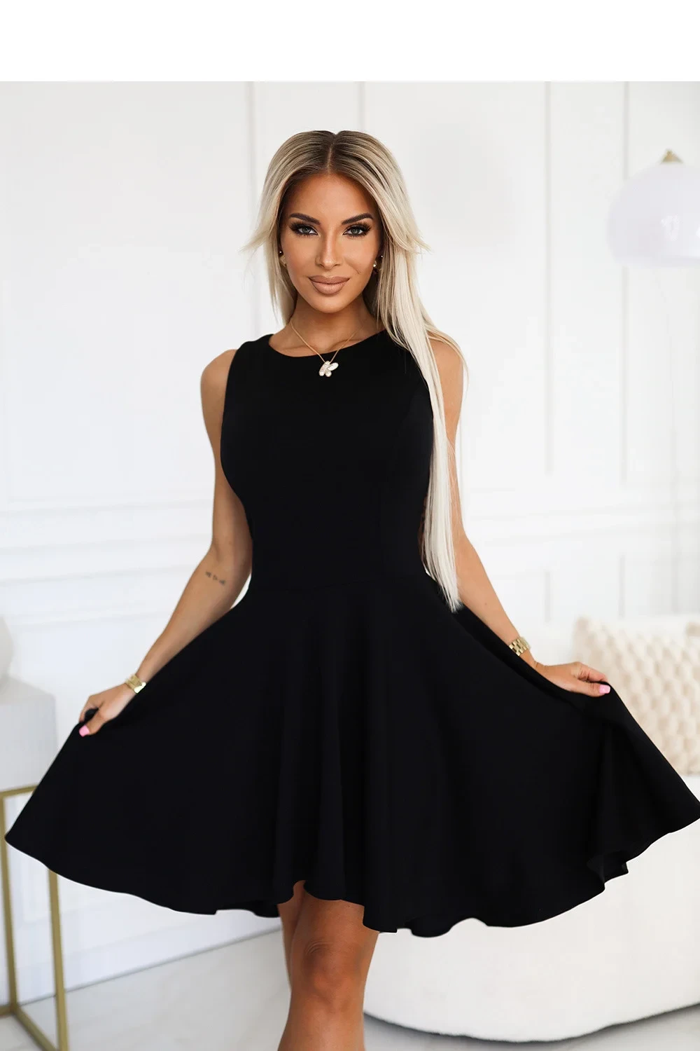 Elegantní černé šaty značky Numoco s delším zády jsou ideální volbou na speciální příležitosti. Vyrobené z elastického materiálu krásně podtrhují postavu a poskytují volnost pohybu, asymetrická sukně dodává lehkost a dynamiku, zejména při tanci. Šaty se zapínají na skrytý zip na zádech. Polský výrobek.