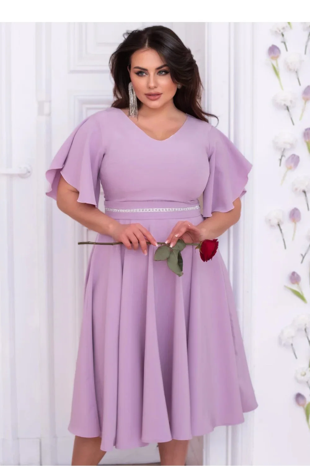 Elegantní šaty v odstínu lilie jsou ideální volbou na speciální události. Vyrobené z materiálu vysoké kvality dokonale padnou na postavu, zdůrazňujíce její přednosti. Model má výstřih ve tvaru písmene V, který jemně zvýrazňuje krk a klíční kosti. Rukávy s volným, volánovým střihem dodávají šatům lehkost a romantický charakter. Pas je zdůrazněn ozdobným páskem s jemným zdobením, co krásně podtrhuje postavu. Rozkročený spodek dodává kreaci lehkost a eleganci. Šaty jsou zapínány na skrytý zip, co zajišťuje pohodlí nošení a ideální přizpůsobení. Skvěle se hodí na svatby, recepce, křtiny a jiné elegantní události.