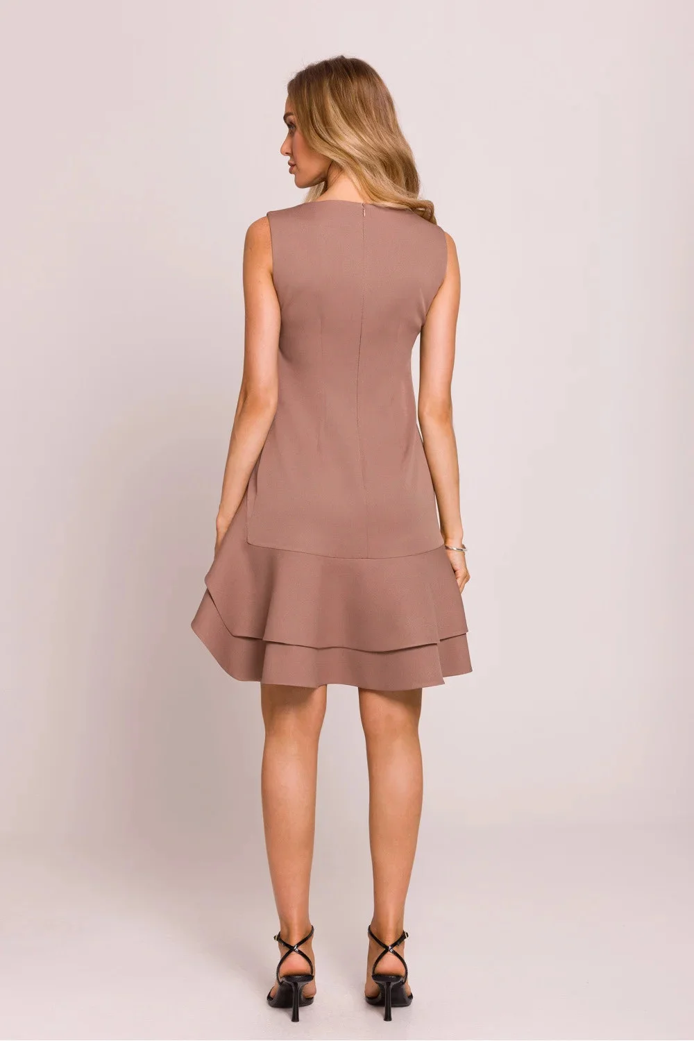 Elegantní, přizpůsobené šaty bez rukávů vyrobené z vysoce kvalitní látky. Model okouzlí asymetrickým spodkem s dvěma volány, které dodávají lehkost a dynamický charakter. Vysoký výstřih na nohu jemně zdůrazňuje postavu a klasický kulatý výstřih dodává celku harmonii. Šaty se zapínají vzadu na skrytý zip, co zajišťuje ideální přizpůsobení. Bez podšívky jsou lehké a pohodlné na nošení. Navrženo a ušito v Polsku s důrazem na každý detail.