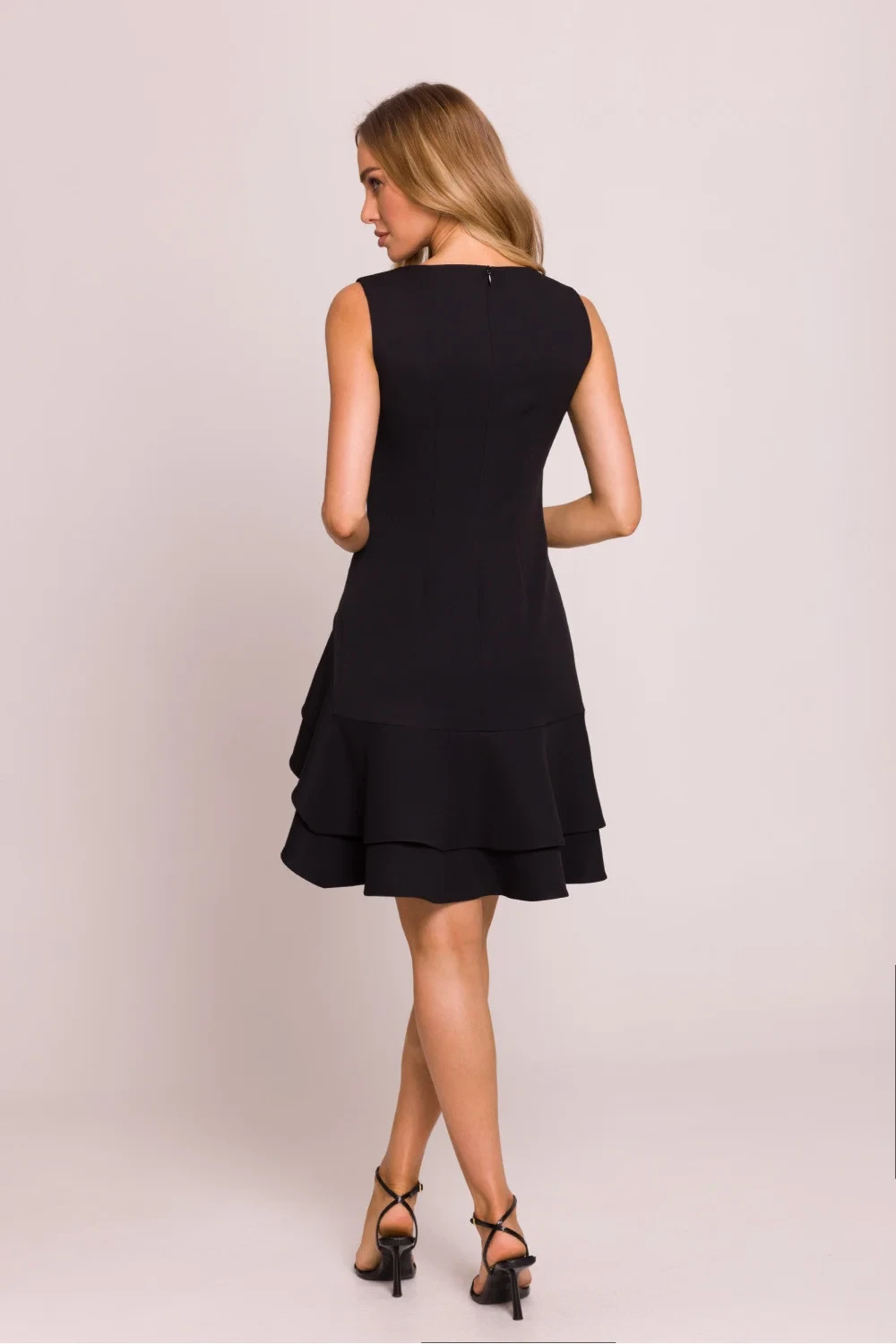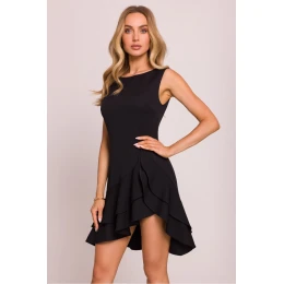 Elegantní, přizpůsobené šaty bez rukávů, vyrobené z vysoce kvalitní látky. Model okouzluje asymetrickým dnem s dvěma volány, které dodávají lehkost a dynamický charakter. Vysoký výstřih na nohu jemně zdůrazňuje siluetu a klasický kulatý výstřih dodává celku harmonii. Šaty se zapínají vzadu na skrytý zip, co zajišťuje ideální přizpůsobení. Chybějící podšívka zajišťuje, že jsou lehké a pohodlné na nošení. Navrženo a ušito v Polsku s důrazem na každý detail.