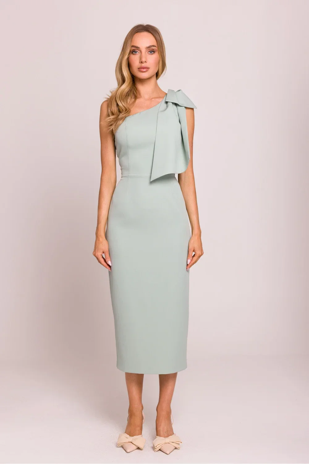 Elegantní midi šaty s olověným střihem, které zdůrazňují ženskou siluetu. Model okouzlí asymetrickým střihem s motivem na jedno rameno, zdobeným efektní mašlí, která dodává eleganci a jedinečný charakter. Vysoký rozpark vzadu jemně odhaluje nohu, dodávají kreaci lehkost a smyslnost. Šaty se zapínají po straně na skrytý zip, co zaručuje ideální přizpůsobení. Částečná podšívka zajišťuje pohodlí při nošení. Navrženo a ušito v Polsku s důrazem na každý detail.